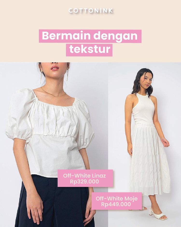 Salah satu outfit andalan para wanita adalah rok panjang yang bisa dipakai untuk segala acara. Rok saat ini hadir dengan berbagai gaya, seperti rok dengan tekstur berlipit seperti Off-White Moje. Selain itu padukan dengan blus dengan detail kerutan yang akan mempermanis penampilan. Tak perlu khawatir meskipun outfit yang dikenakan hanya bernuansa warna putih-putih dan terlihat membosankan, justru adanya sentuhan tekstur akan memberikan kesan yang berbeda. Penampilanmu terlihat anggun jika kamu pinta bermain tekstur untuk urusna outfitmu. Silahkan dicoba referensi satu ini ya, girls!