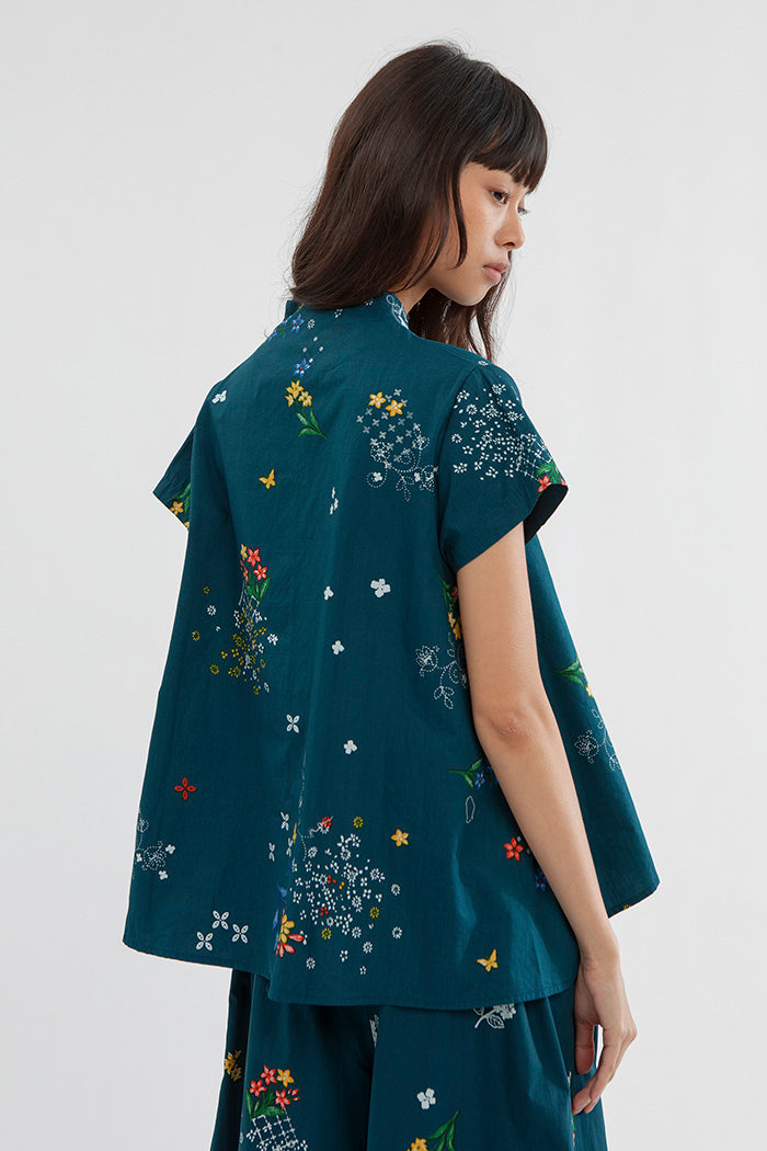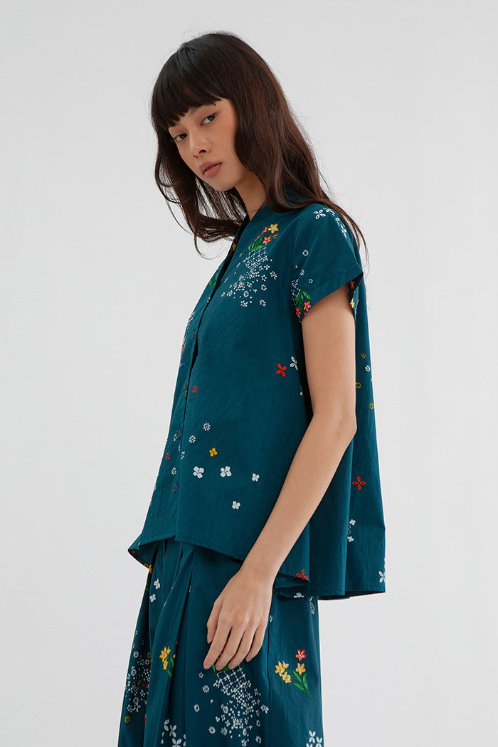 Cut from lightweight cotton with hand screen printed batik, this shirt features a relaxed, flared silhouette, high neckline and cap sleeves.