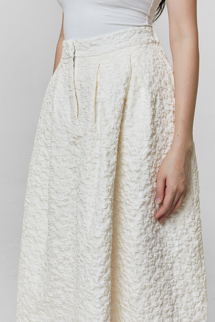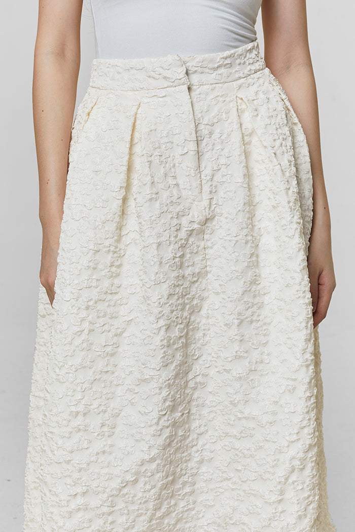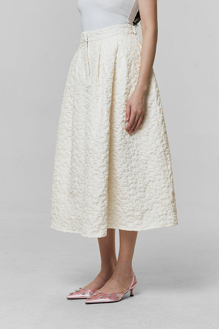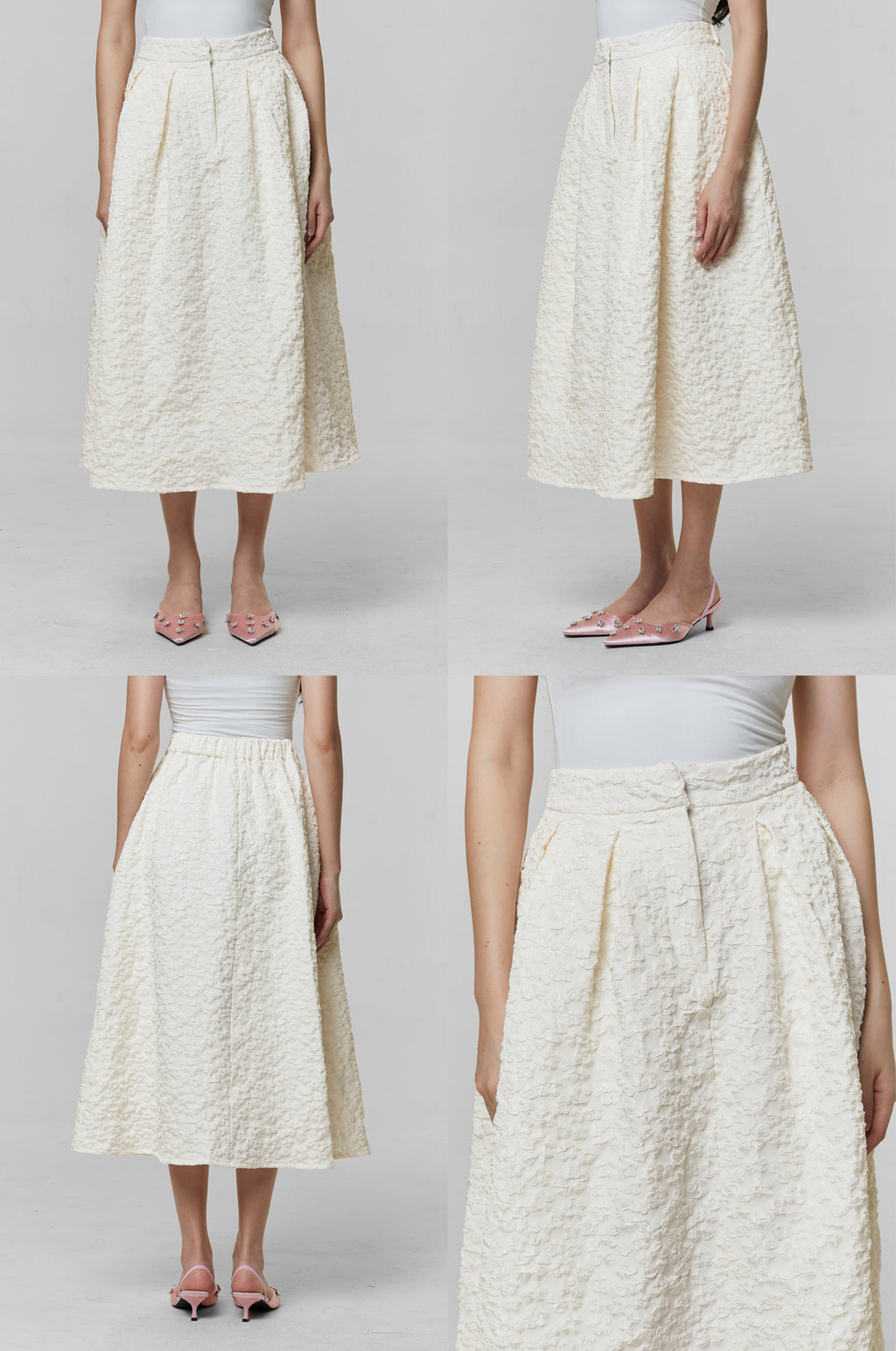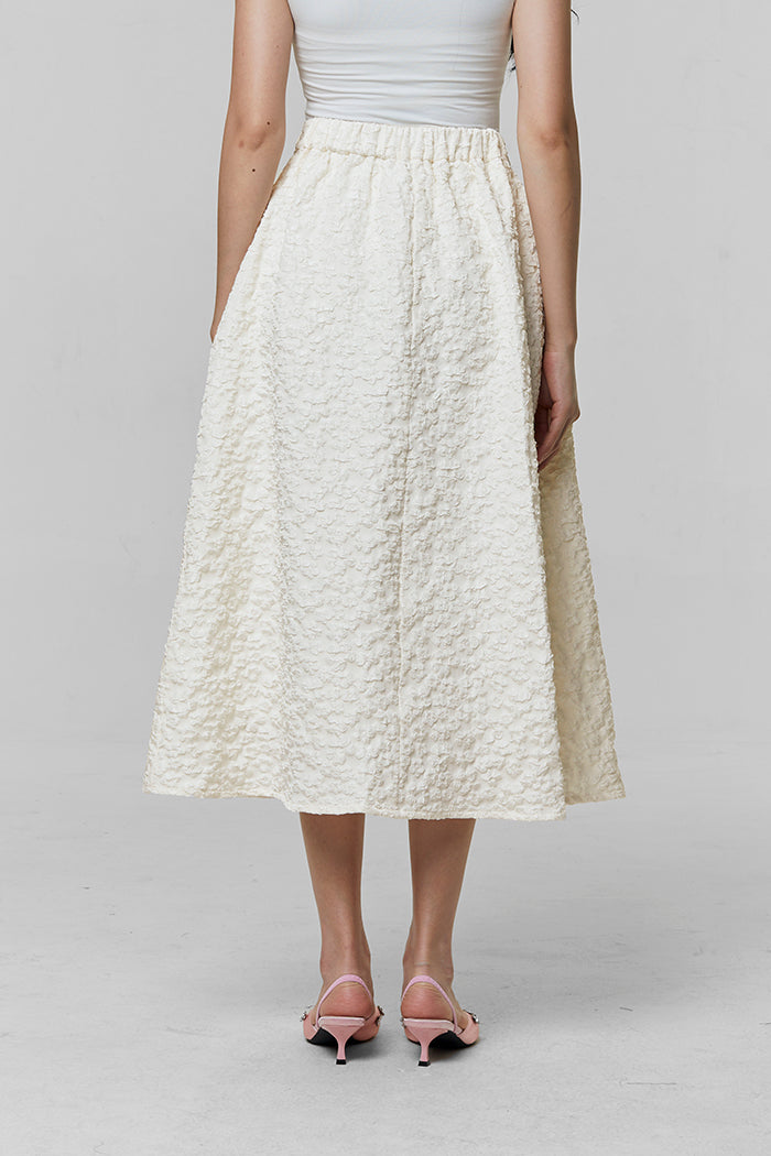 Elegant and feminine, this skirt is cut from textured fabric in a classic A-line silhouette that flatters the waist and falls to a softly flared midi hem.