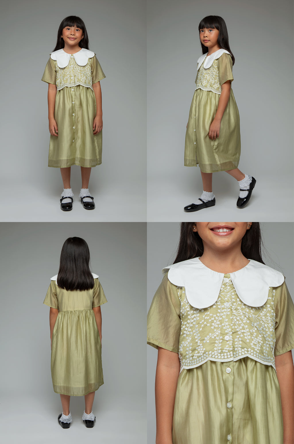 Dress your little one in this classic, girly dress and be ready to capture lasting memories at Eid family gathering. Features short sleeves, an oversized scalloped collar, a flared silhouette, and a button up opening.
