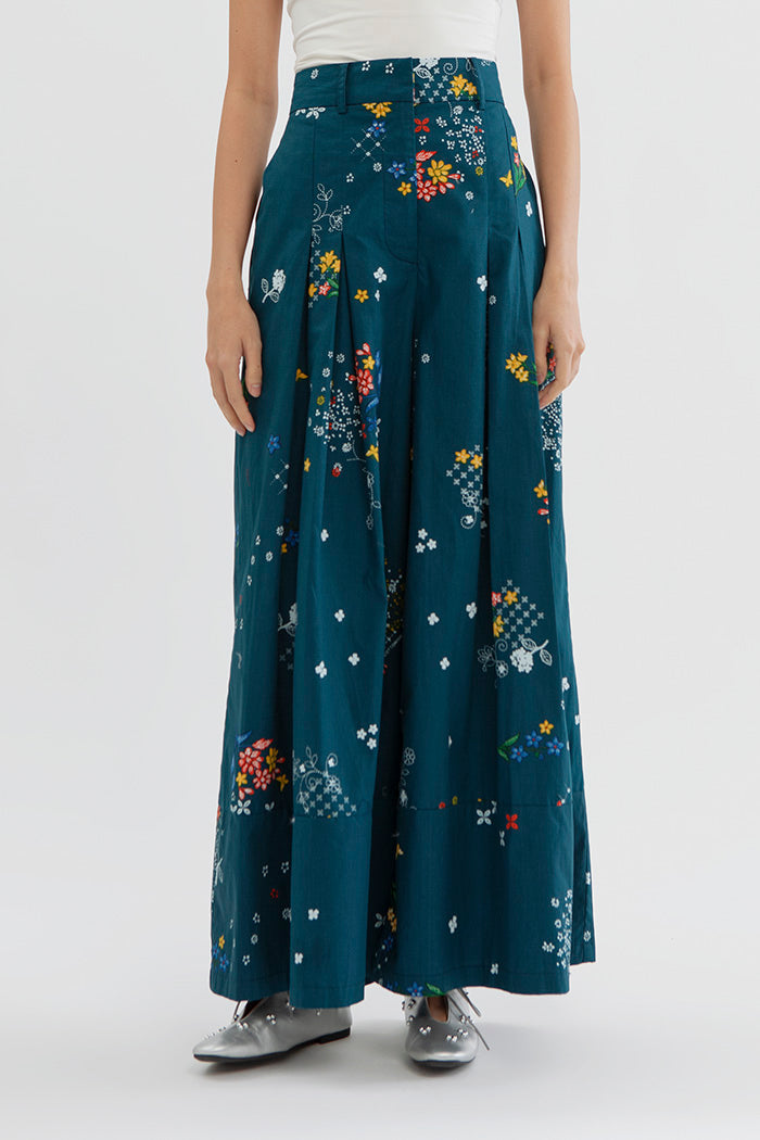Cut from light weight cotton, these pleated pants are designed with a high rise, wide legs for an elongating effect and cut and sewn hemline. Wear it with the matching top, Candrani Puspa Biru.