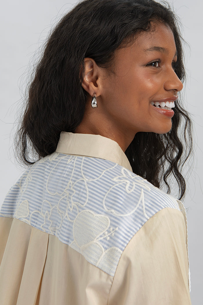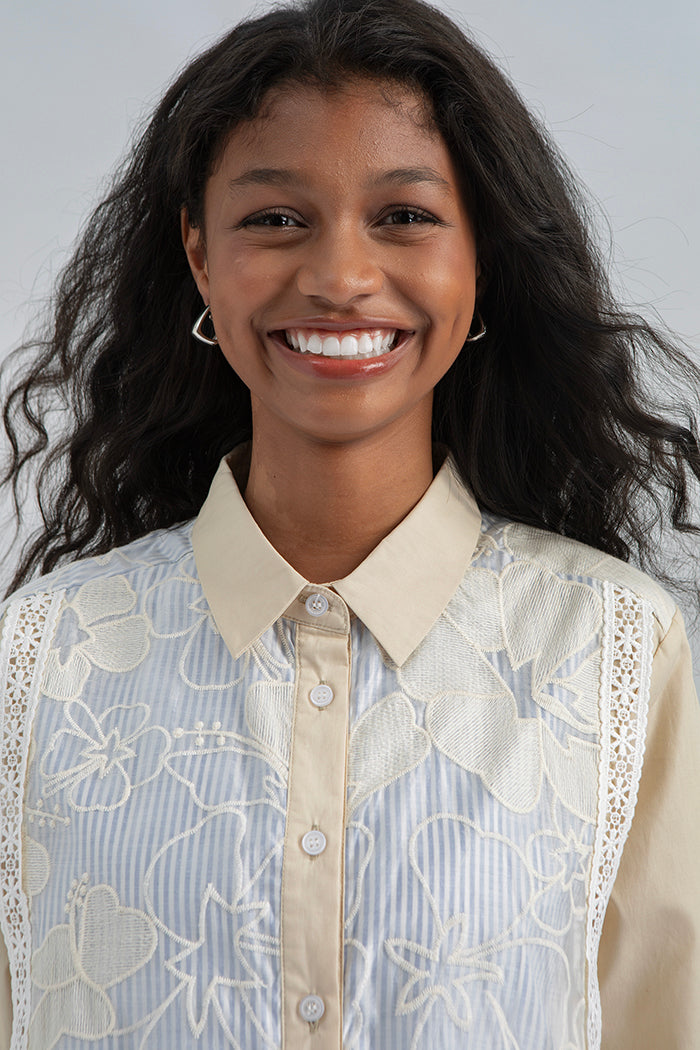 Cut from breathable cotton, this shirt combines voluminous sleeves with a layered lace front panel, creating a loose yet feminine silhouette.