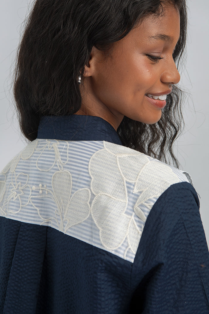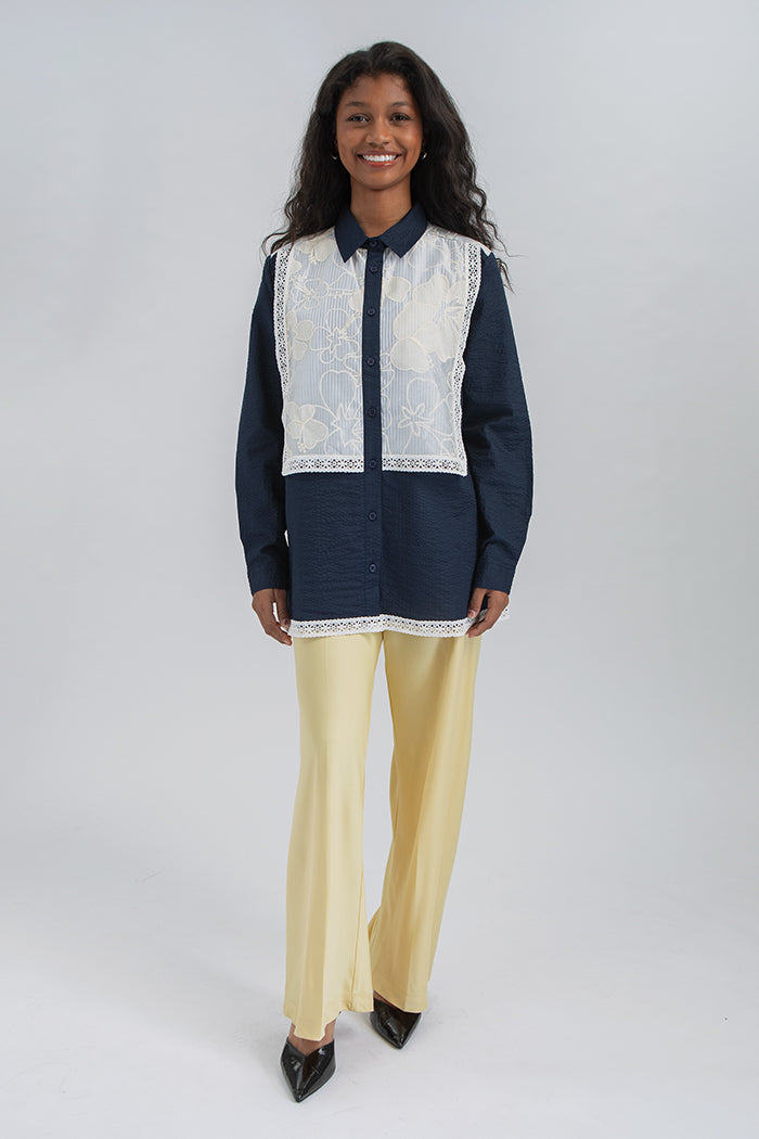 Cut from breathable cotton, this shirt combines voluminous sleeves with a layered lace front panel, creating a loose yet feminine silhouette.