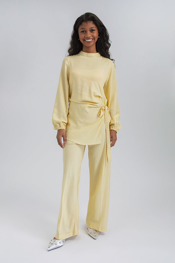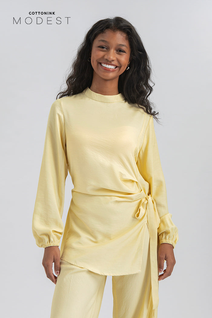 Cut from rayon-blend fabric, this sleek long-sleeve shirt is designed with a high neckline and puffy sleeves, and accented with a side tie detail that accentuates your silhouette. A lovely choice for relaxed Ramadan dinners or elegant iftar outings.