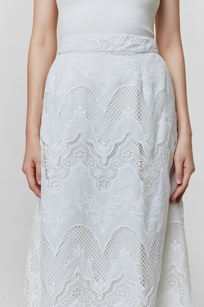 Elegant and feminine, this skirt is cut from delicate floral lace in a classic A-line silhouette that flatters the waist and falls to a softly flared midi hem.