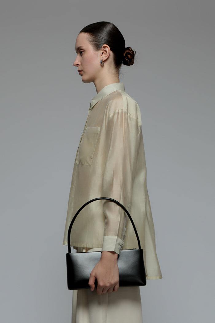 This shirt is crafted from a sheer, weightless tencel-blend fabric that falls effortlessly in an oversized silhouette. Layer it over a bralette or silk slip dress for an understated evening look, or pair it with tailored trousers and flat sandals for an elevated daytime look.