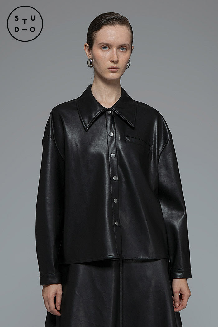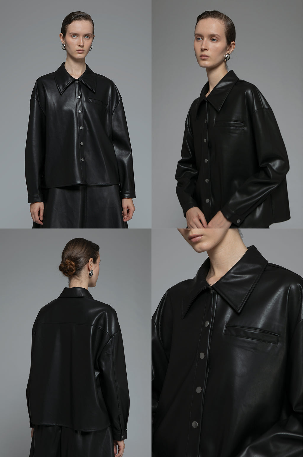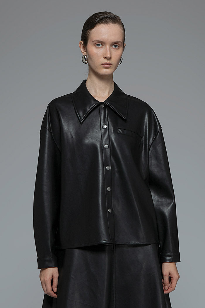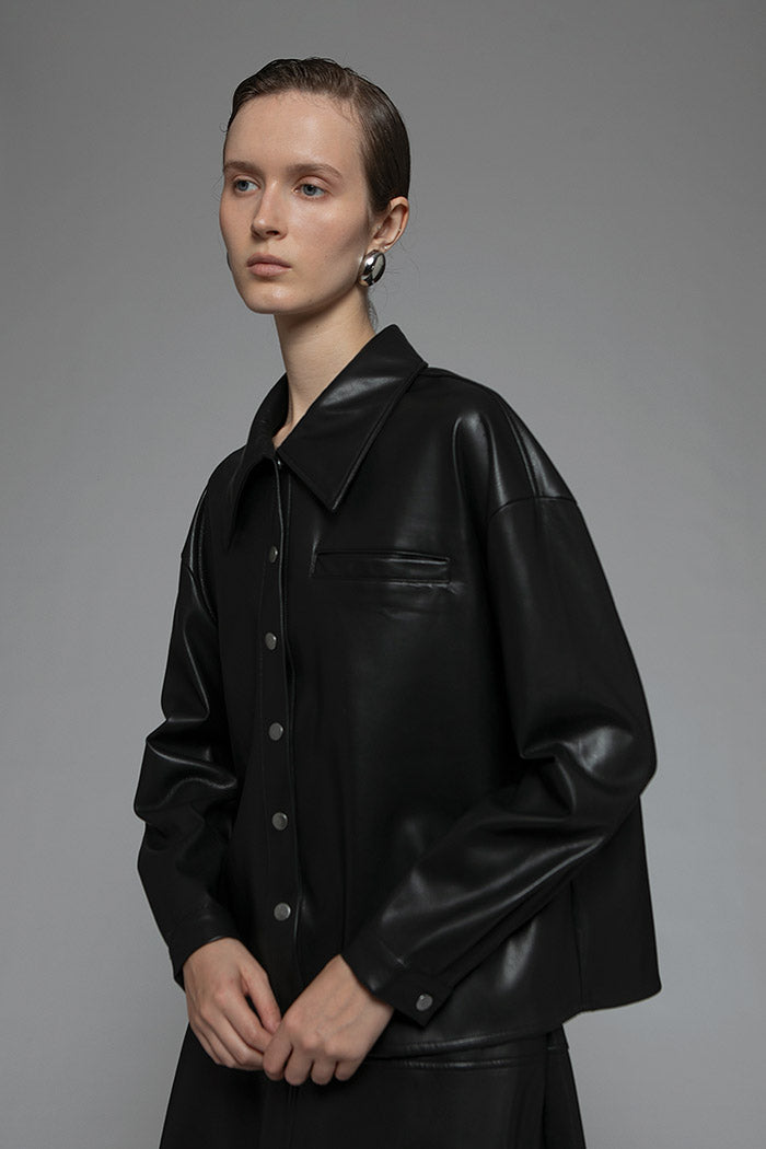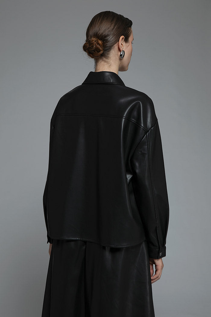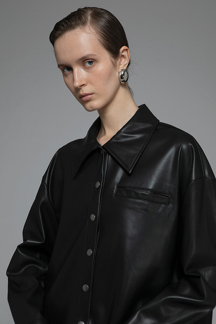 Cut for an oversized silhouette, this faux leather jacket brings edge to everyday dressing. Wear yours layered over a dress or with the matching skirt, Black Boyd.