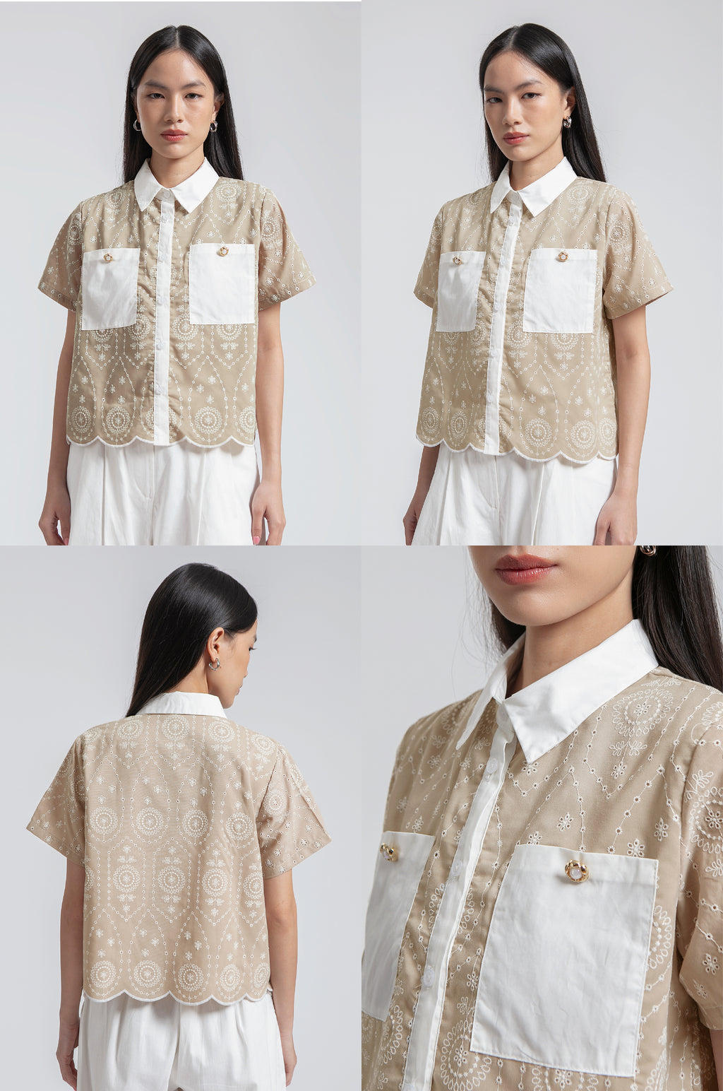 Cut from breathable cotton-blend fabric, this short sleeve shirt balances form and function with its voluminous sleeves, boxy silhouette, and two front pockets.