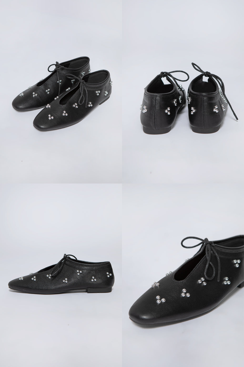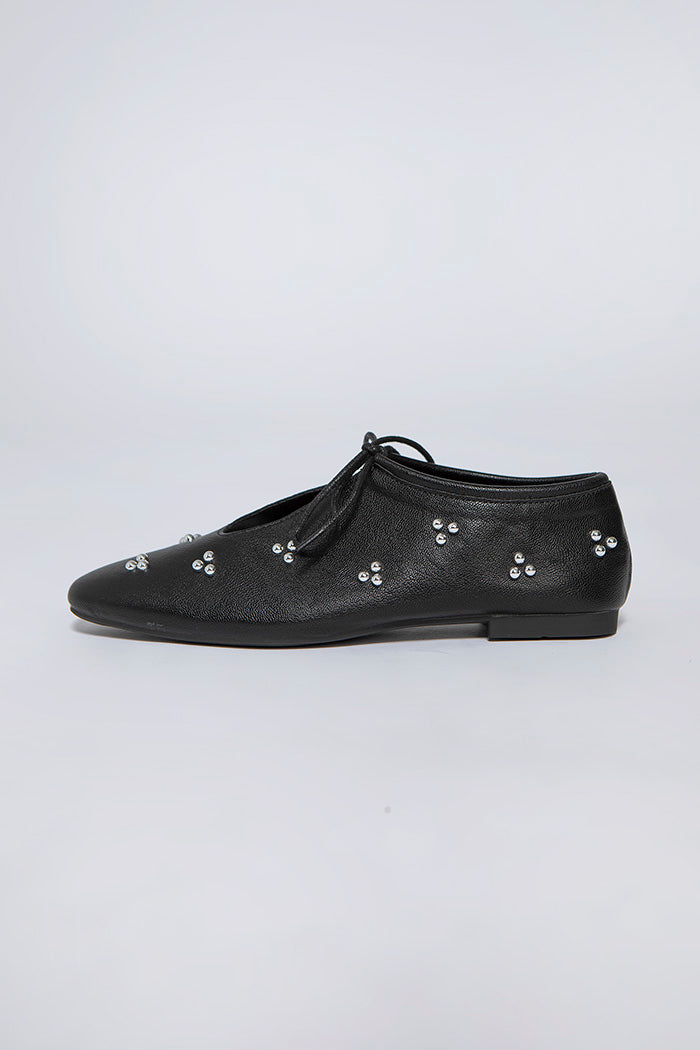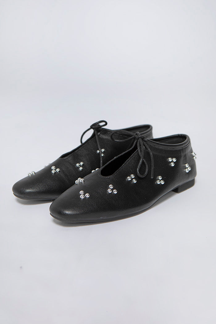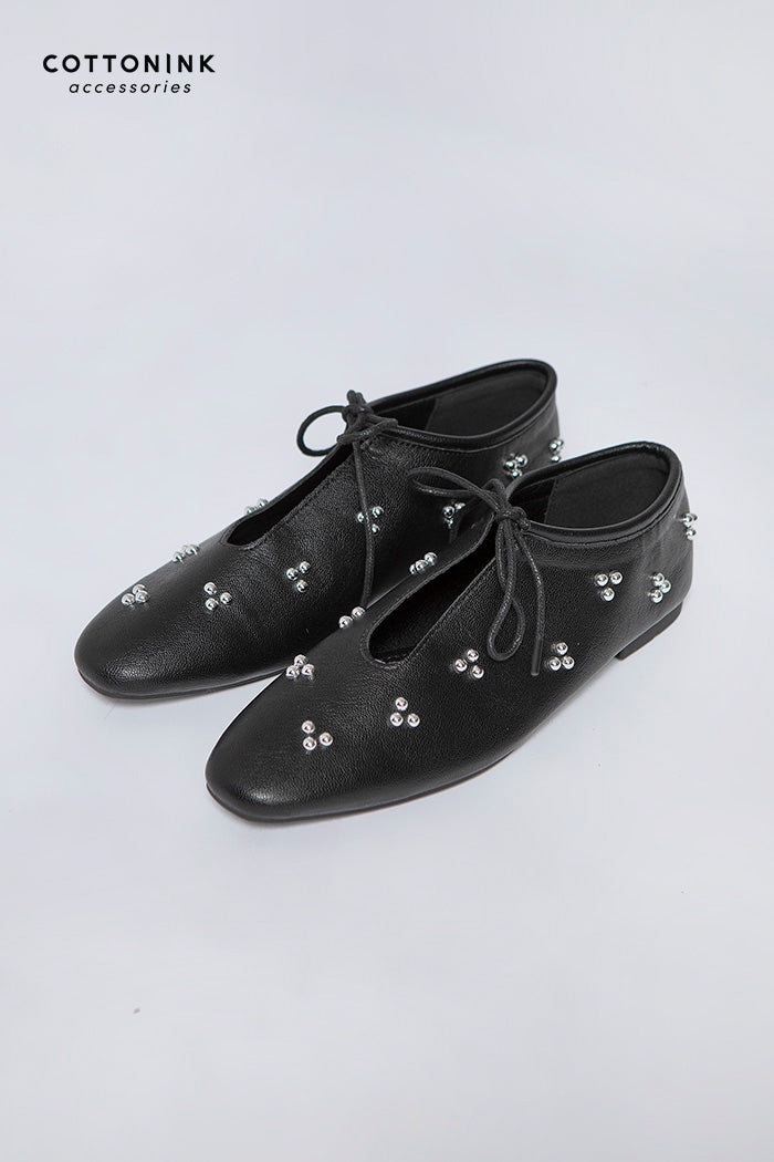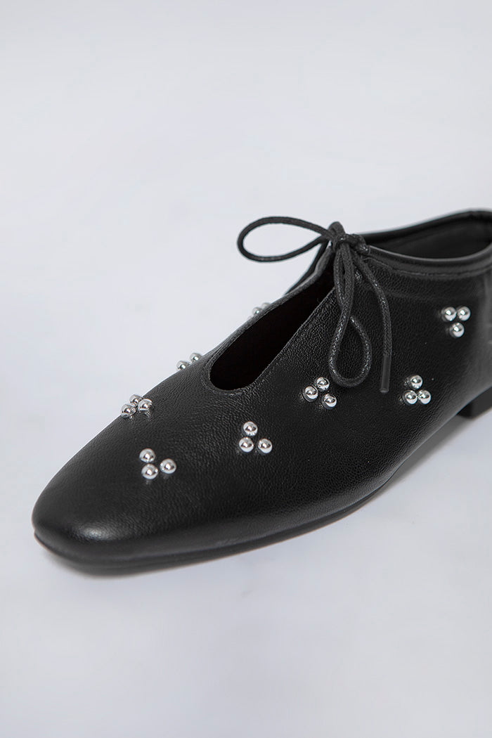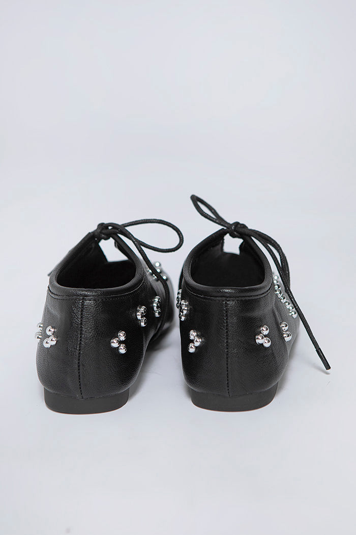 These flats combine round metal embellishments with tie details for a look that's both feminine and playful.