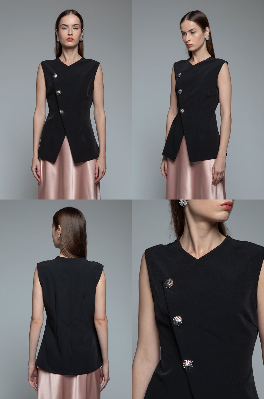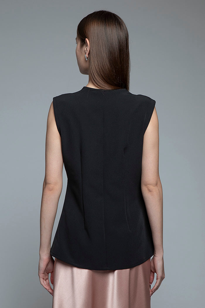 Cut from lightweight fabric, this vest features a clean wrap-style front that overlaps across the body, creating an elegant V-neckline and an elongated silhouette.