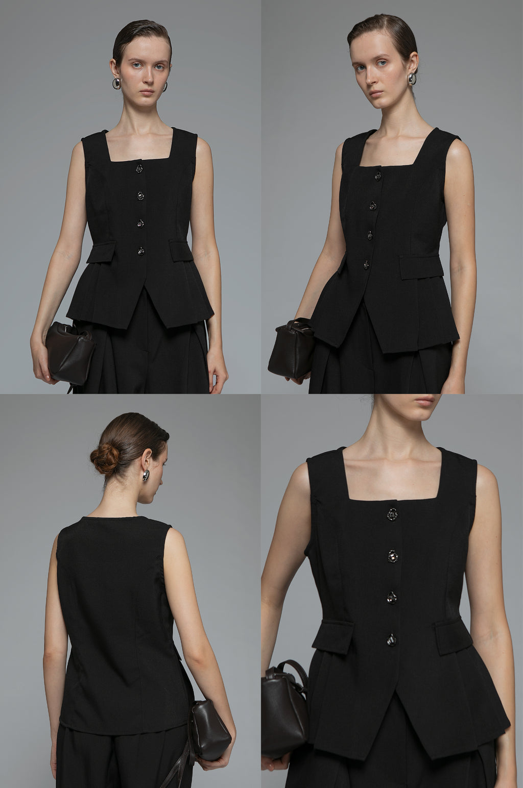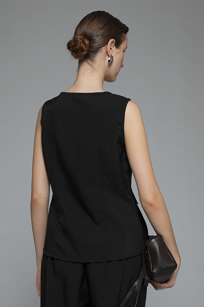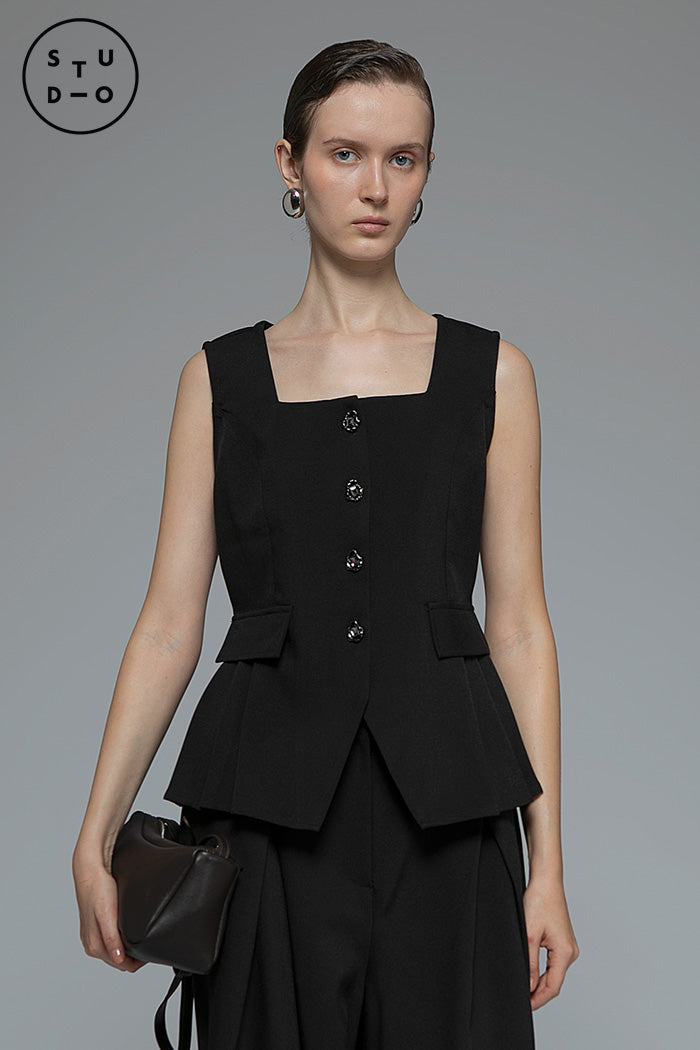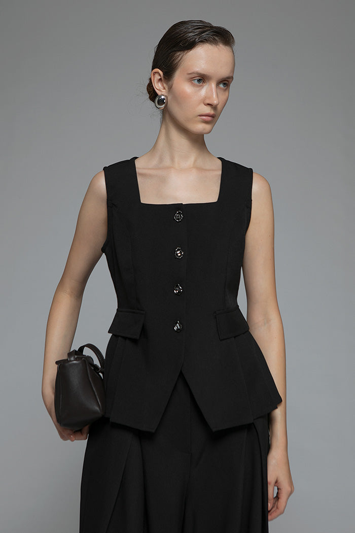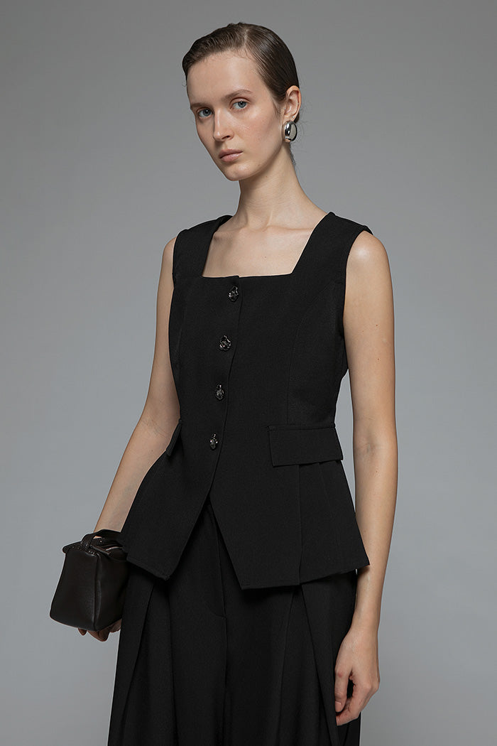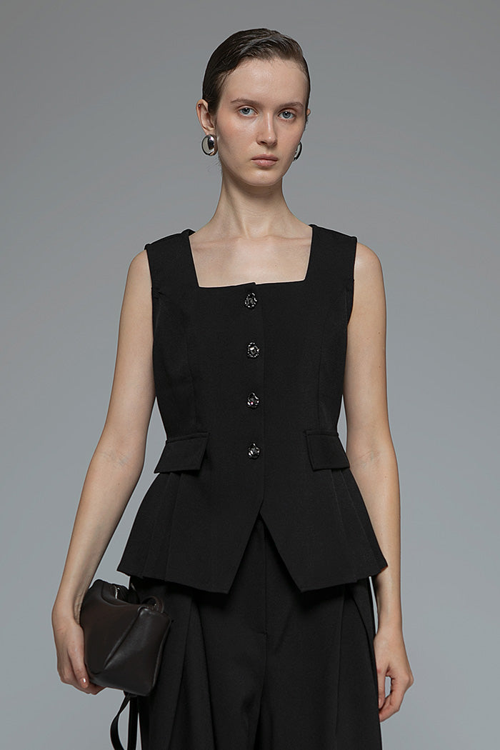 With its square neckline and flared hem, this sleeveless top is designed to frame the upper body and accentuate the waist.