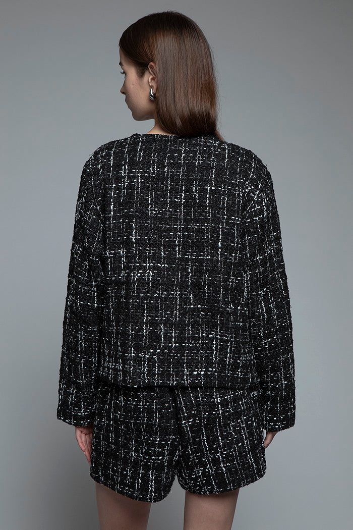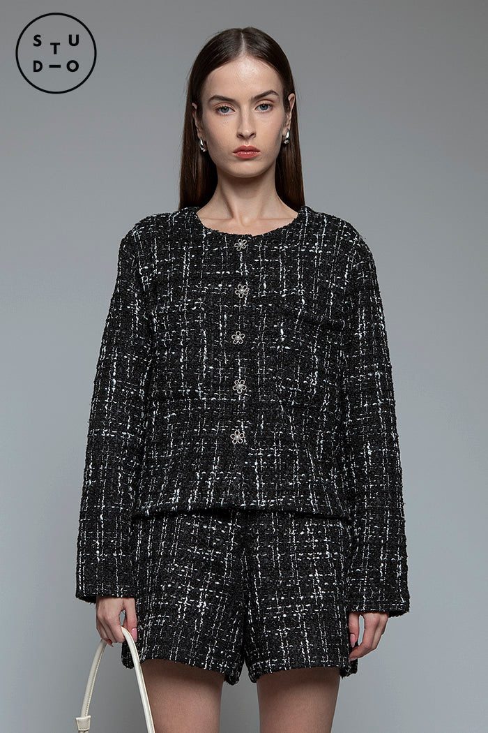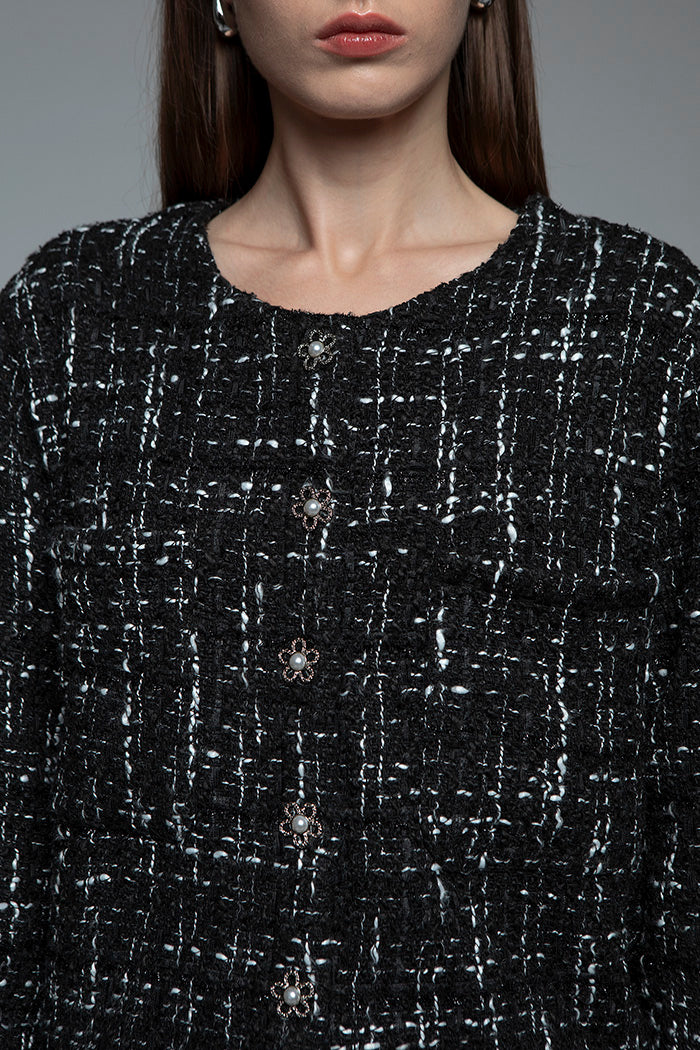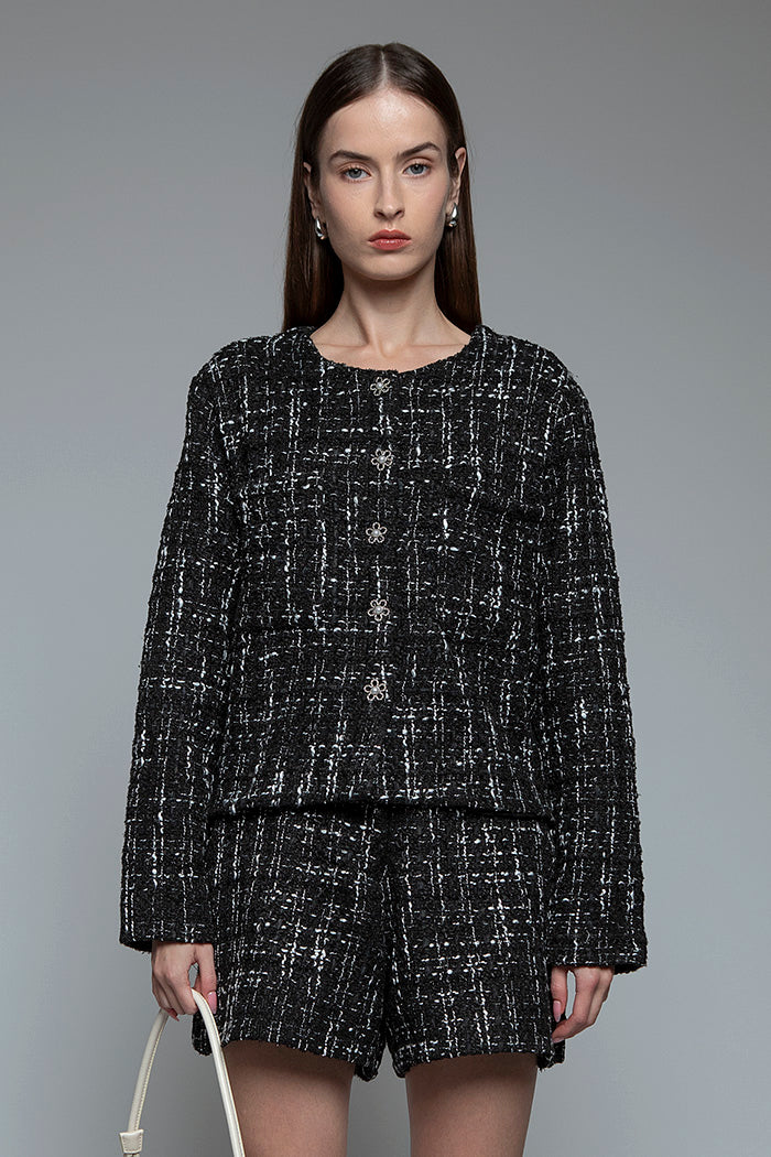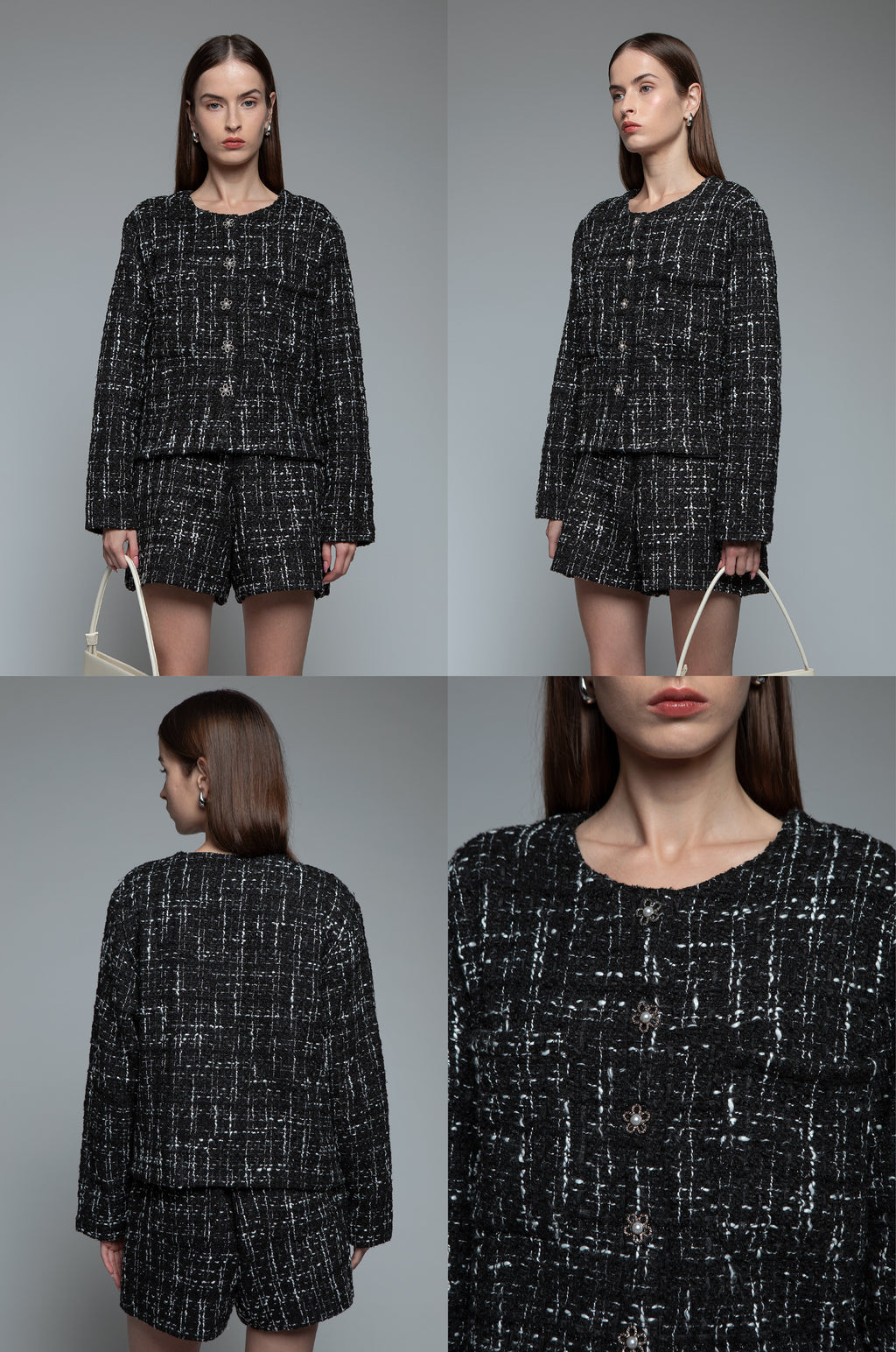This tweed jacket brings together classic tailoring and modern simplicity. Layer it over a satin camisole and trousers for evening gatherings, or pair it with jeans and loafers for an off-duty look that still feels celebratory.
