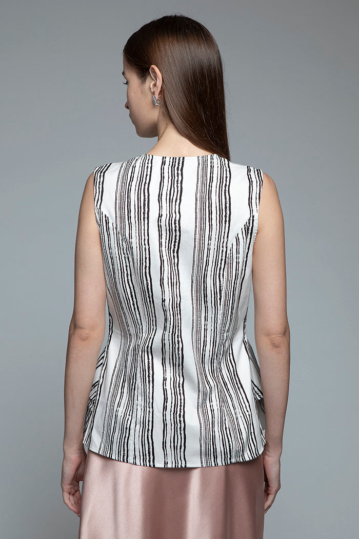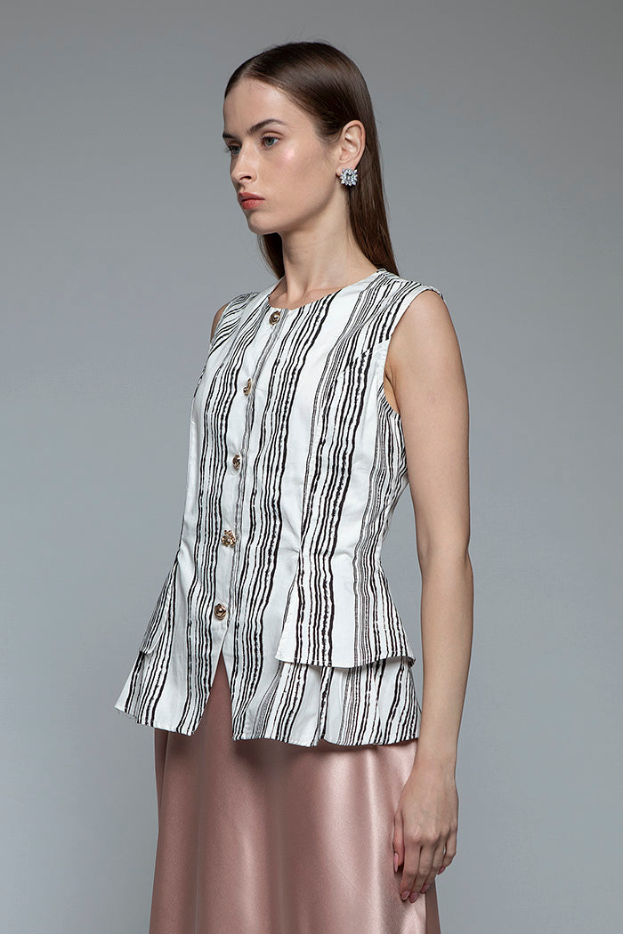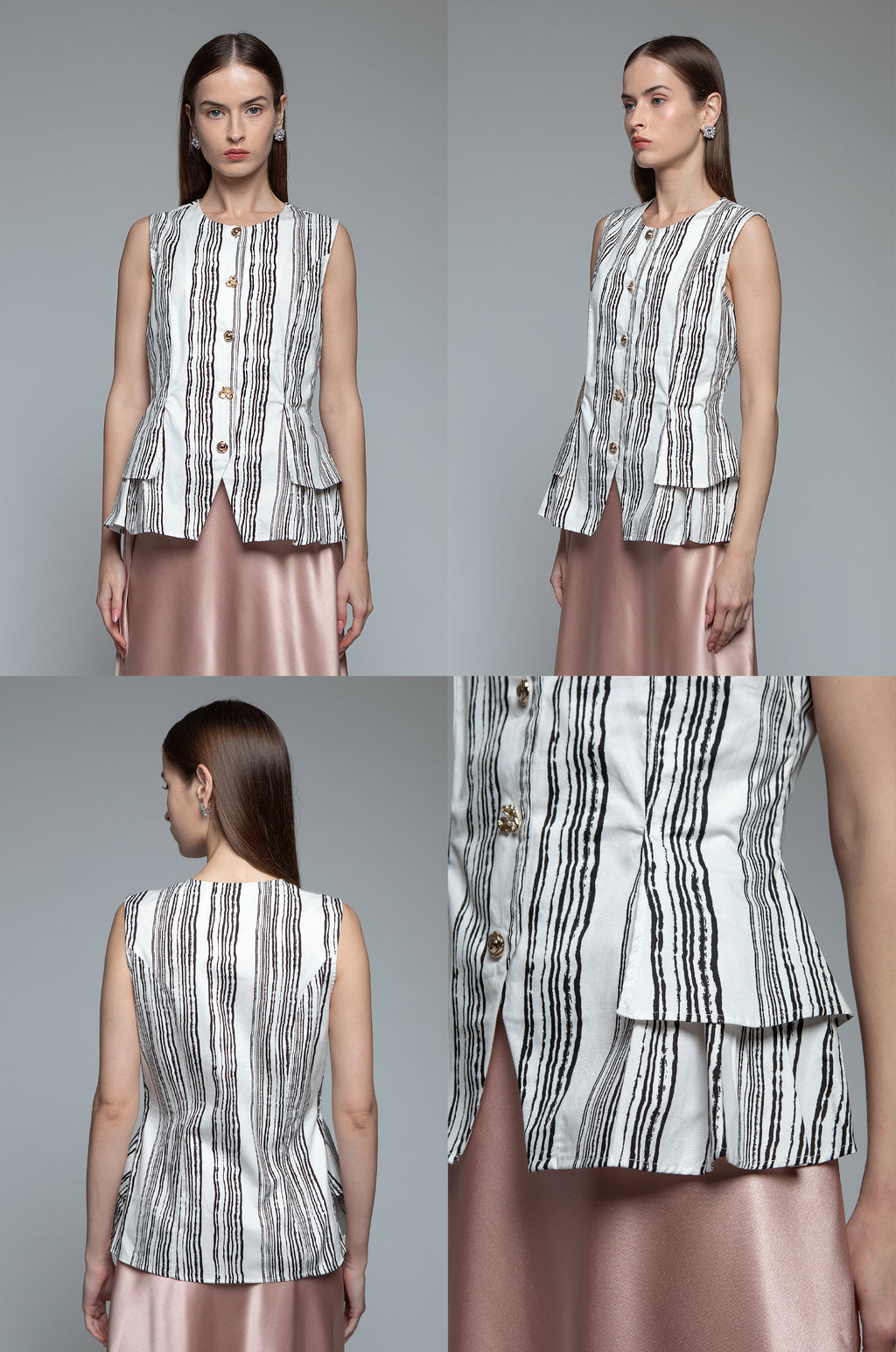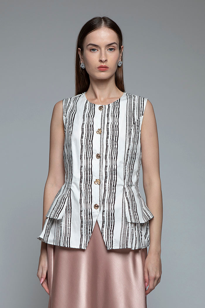 A distinct take on the classic vest. Cut from cotton, this striped vest is designed with peplum hem that adds an elegant touch to your wardrobe. Wear yours with a pair of wide leg pants and your favorite flats.