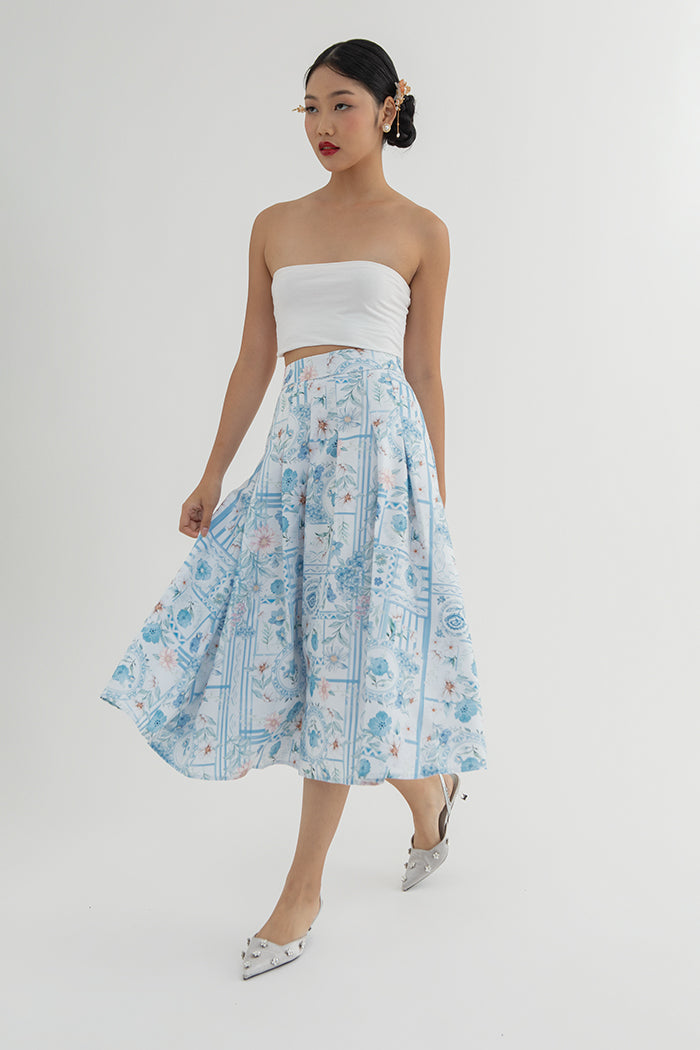 This floral midi skirt features exclusive Chinese porcelain print and soft pleats that create a graceful silhouette. Pair it with a sleeveless top or your favorite long sleeve shirt for an chic CNY outfit.