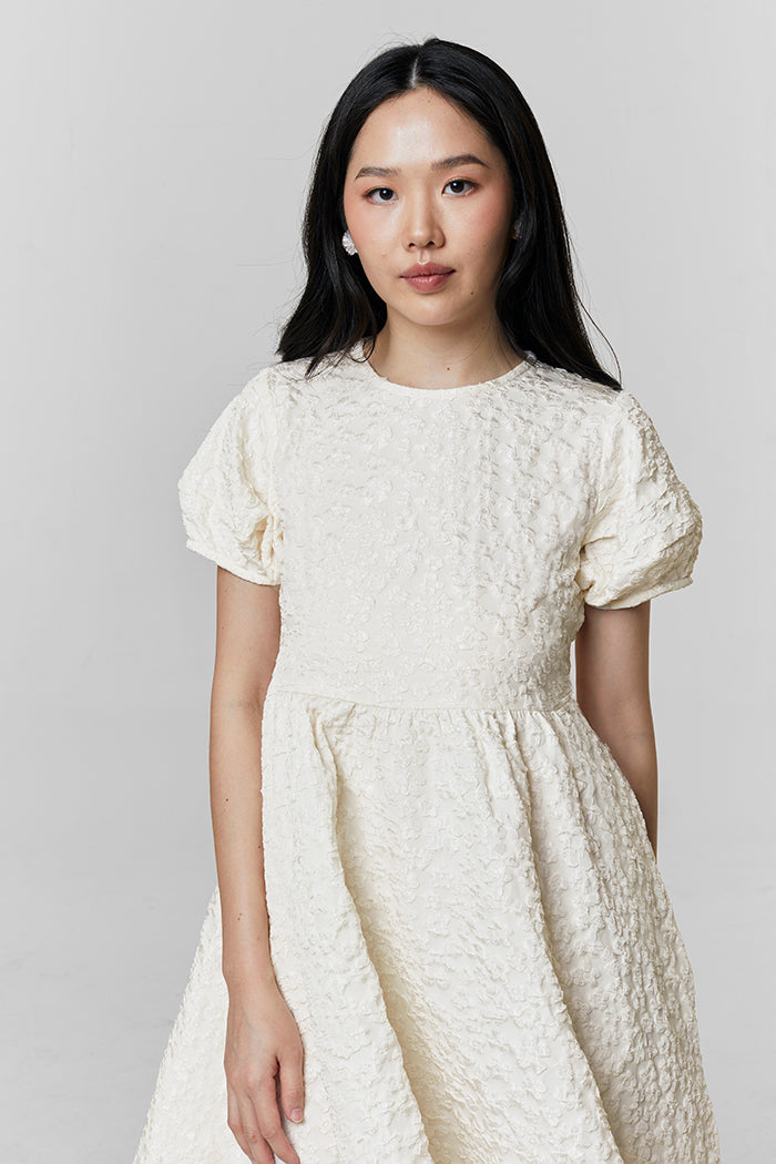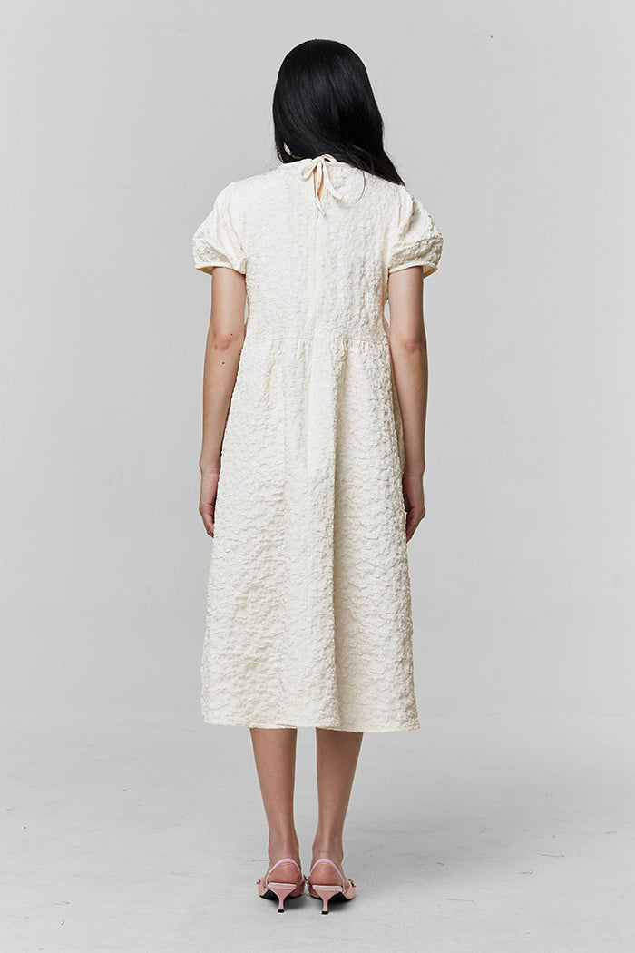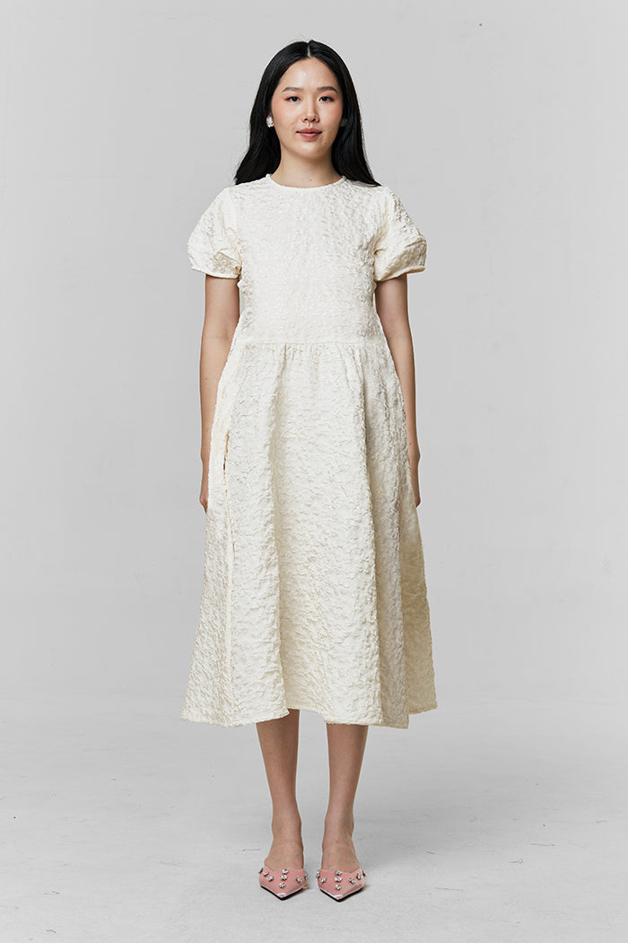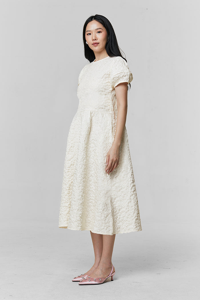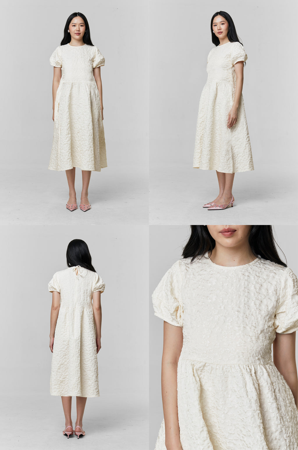 This dress captures effortless elegance with its voluminous puff sleeves and flattering midi silhouette that cinches slightly at the waist before falling into a gently flared skirt that moves beautifully with every step.