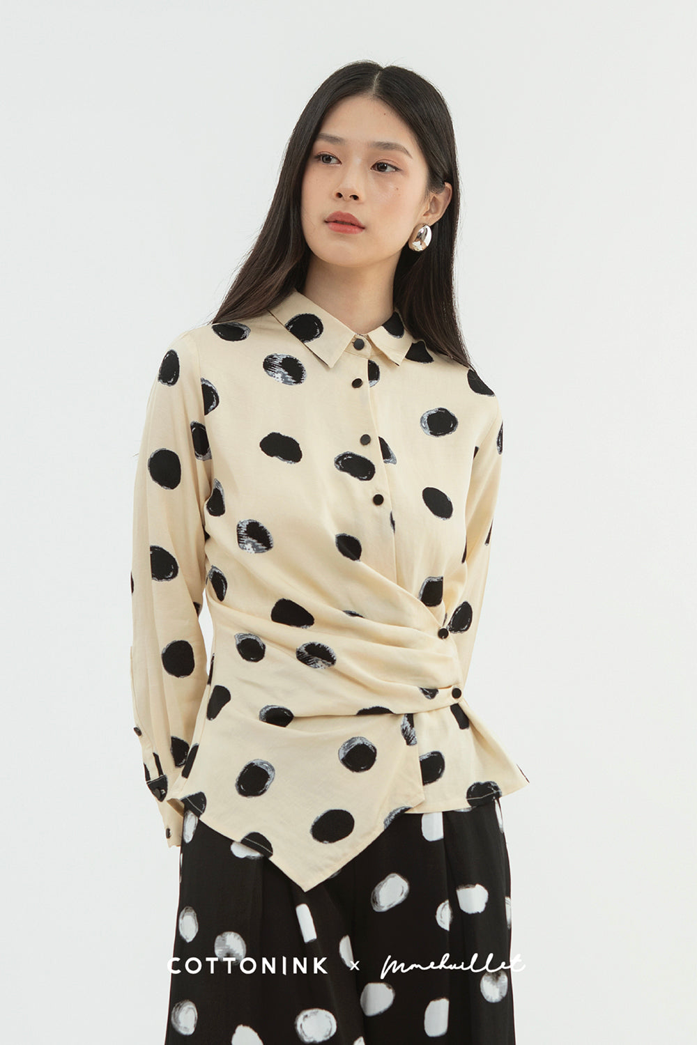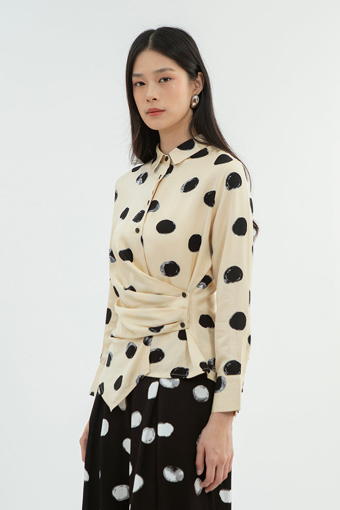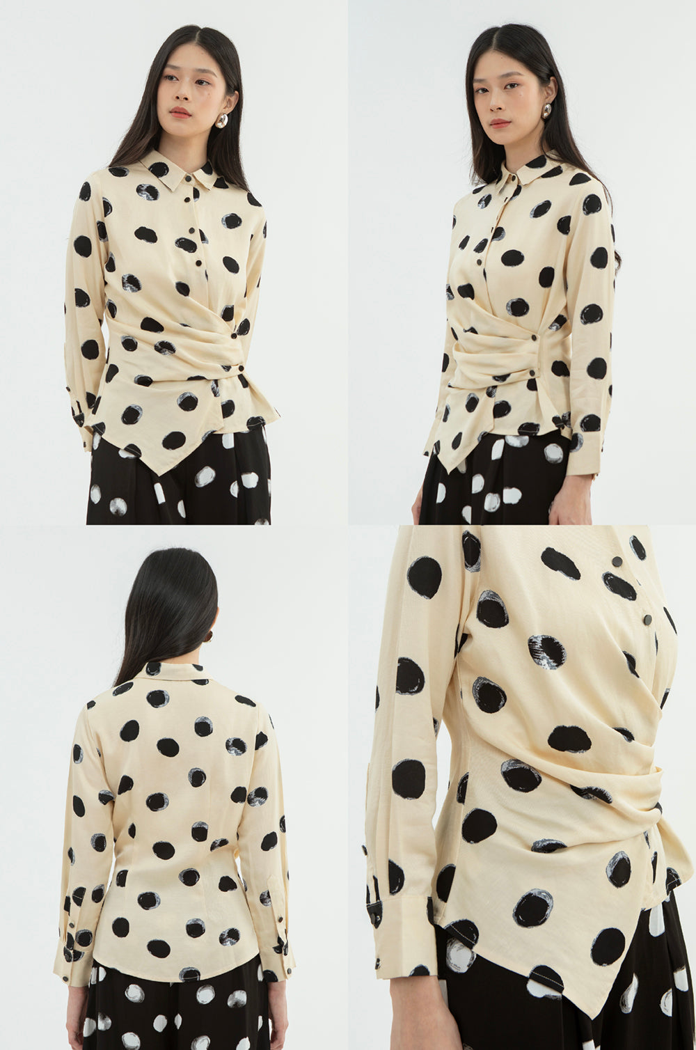 This long-sleeve shirt features a one-sided draped front, creating an elegant asymmetrical silhouette. Crafted from breathable viscose blend fabric, this item is definitely a standout piece you'll love for many years to come.