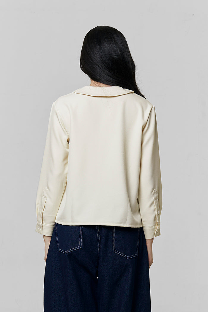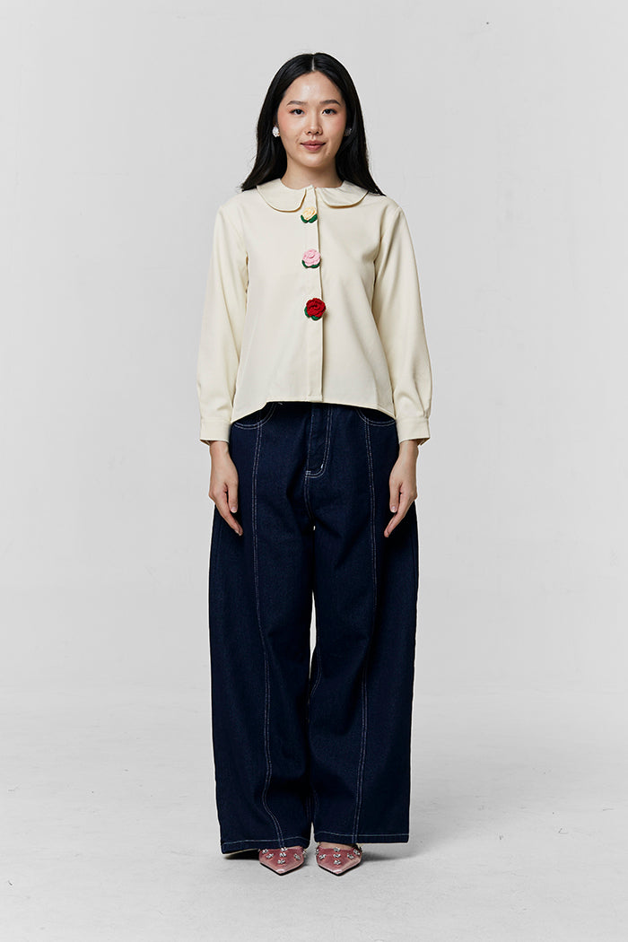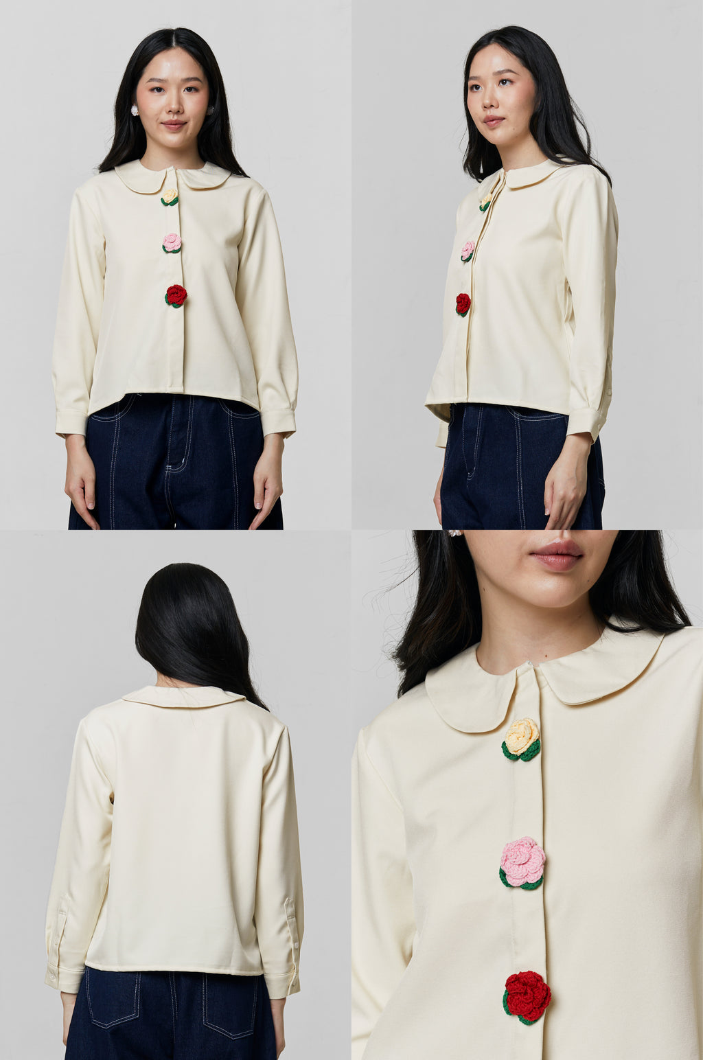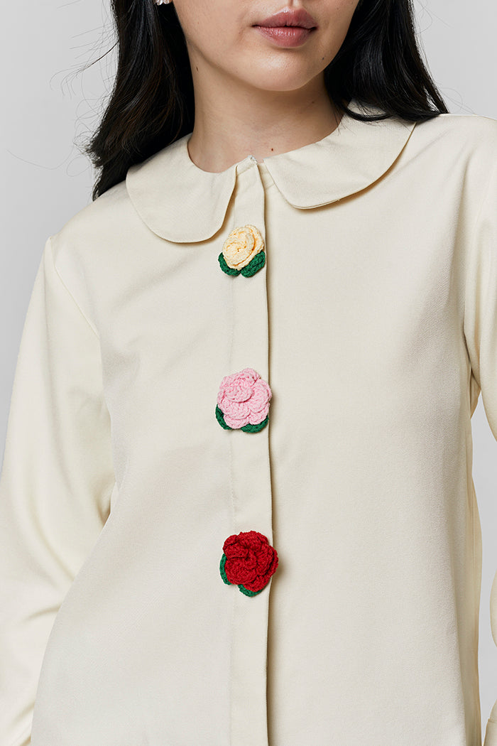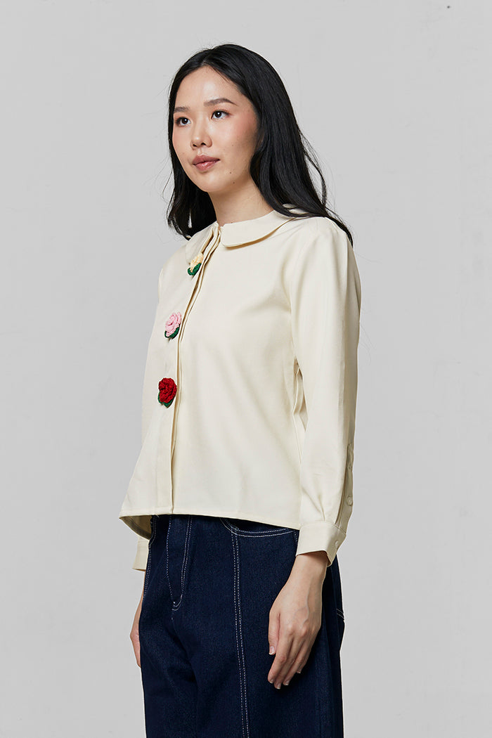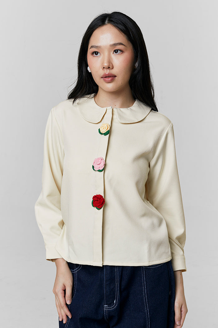 Designed with a peterpan collar, flower crochet detailing, and a regular fit, this shirt puts a feminine spin on a classic everyday shirt.