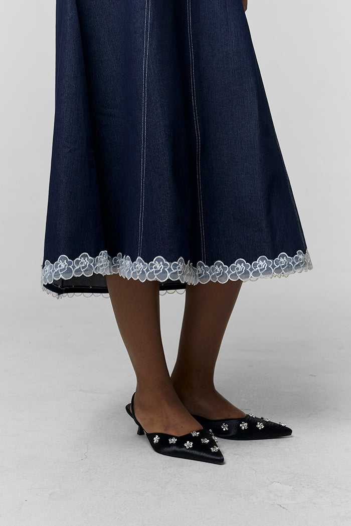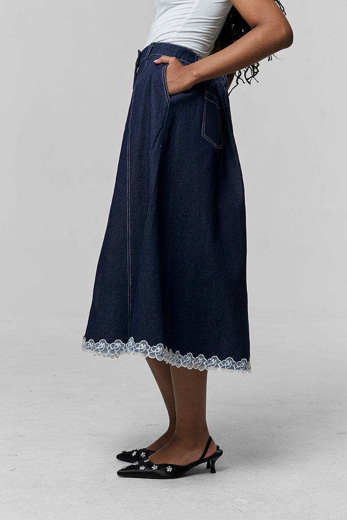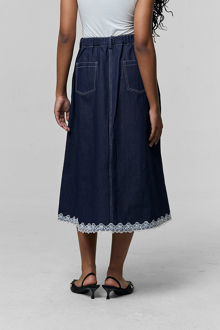 This skirt is crafted from cotton-denim with a flattering A-line silhouette that skims the waist and hips before gently flaring into a midi length. Wear yours with your favorite fitted tee.