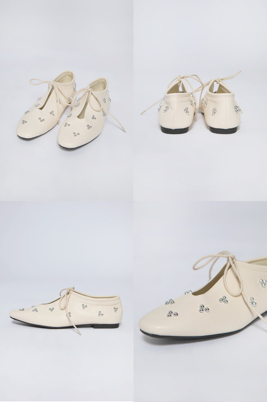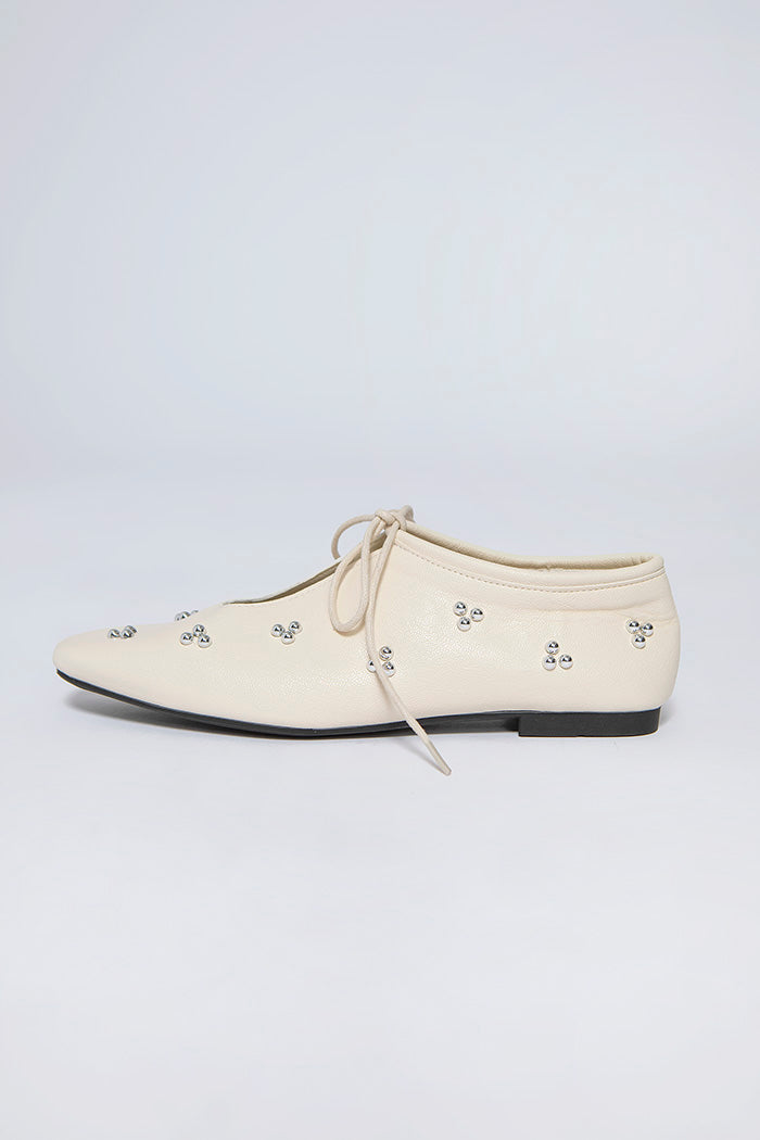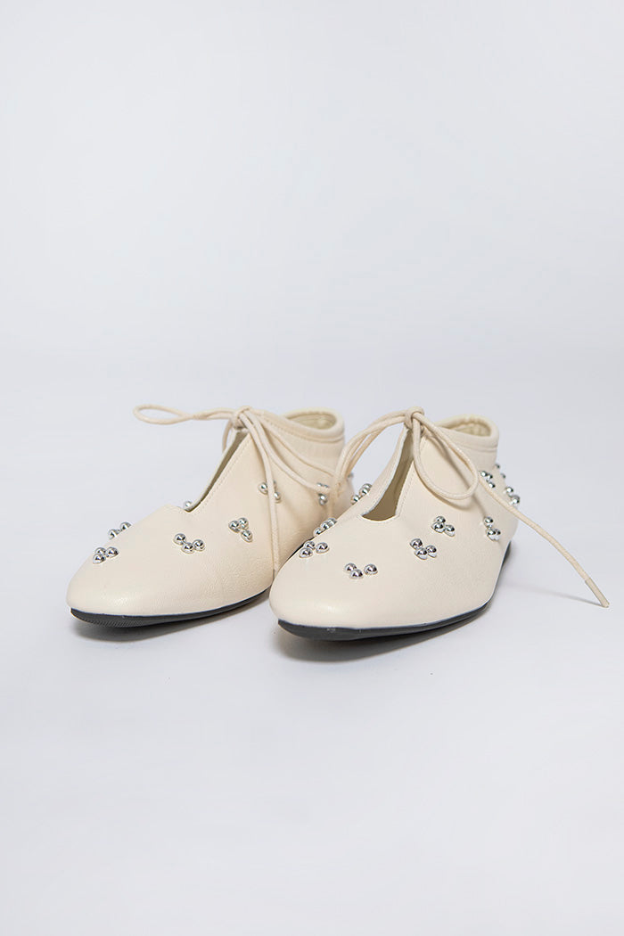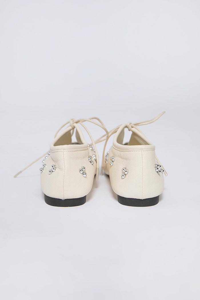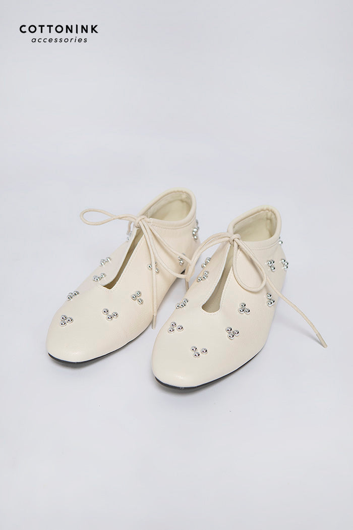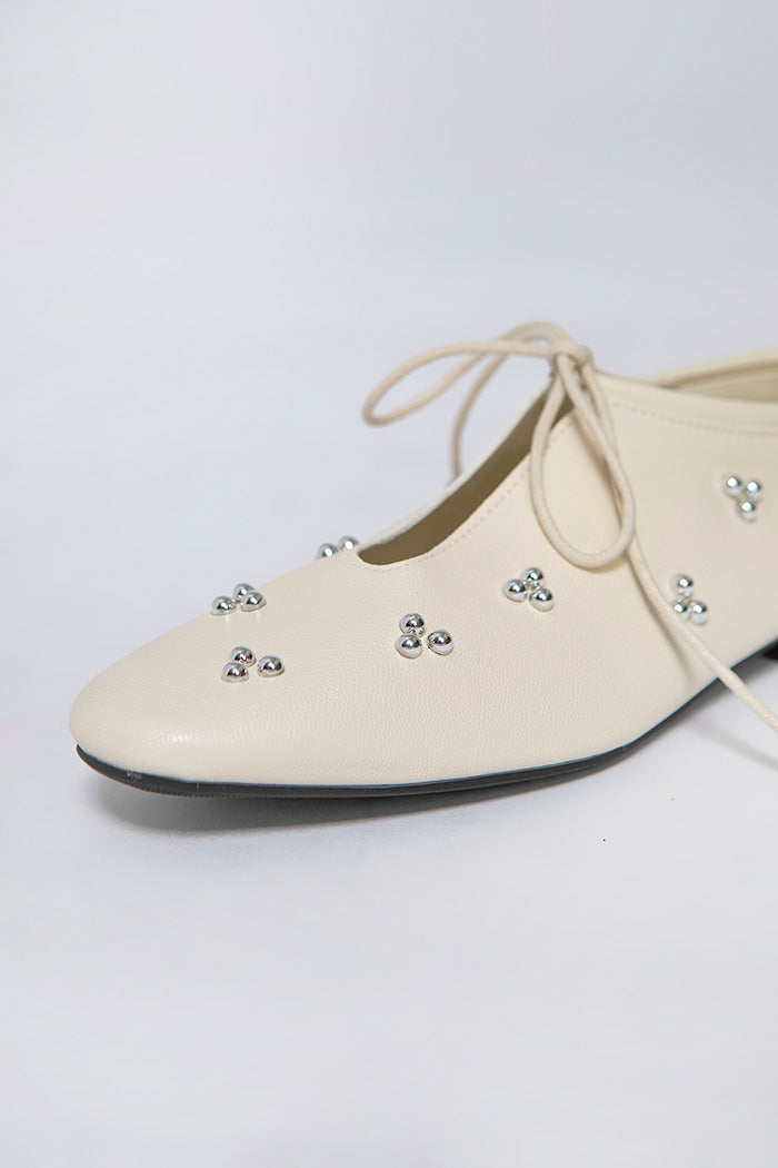 These flats combine round metal embellishments with tie details for a look that's both feminine and playful.