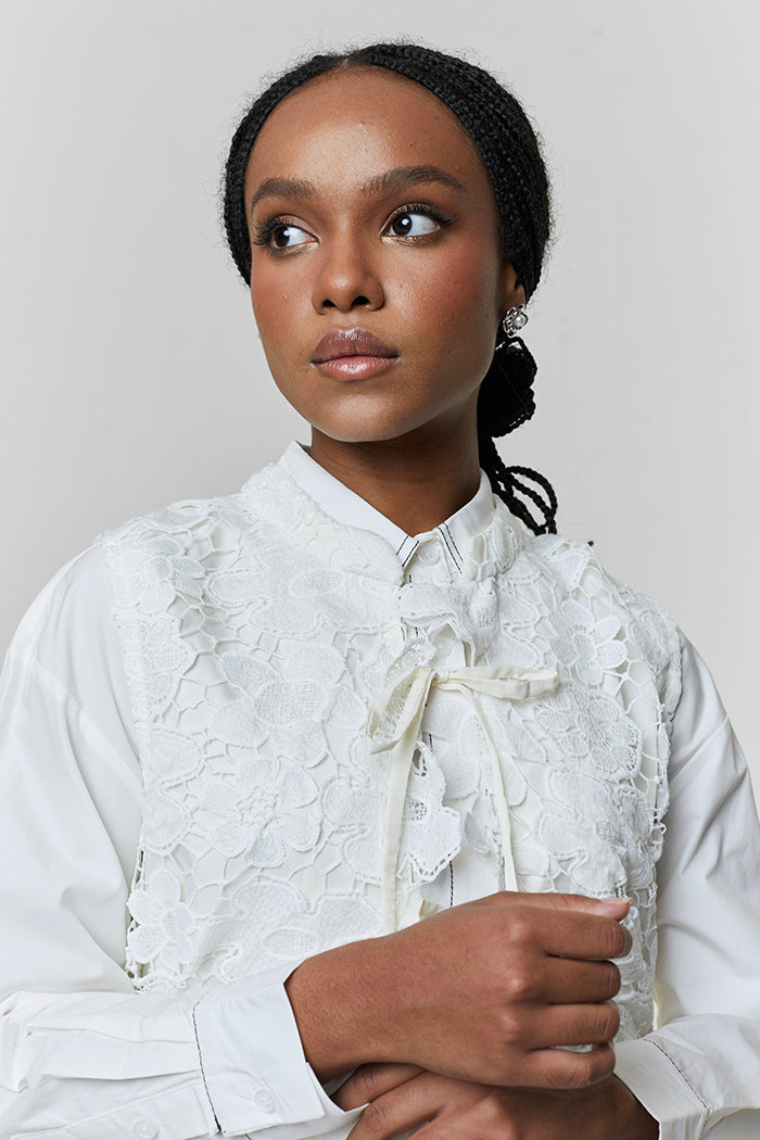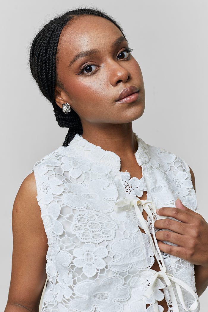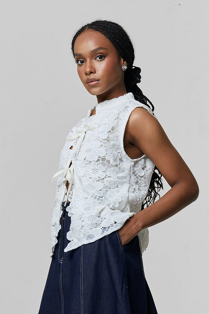 This top is cut from delicate floral lace and features a front tie closure that adds a touch of undone elegance. The sleeveless silhouette is cut close to the body, with a subtle flare at the hem for movement.