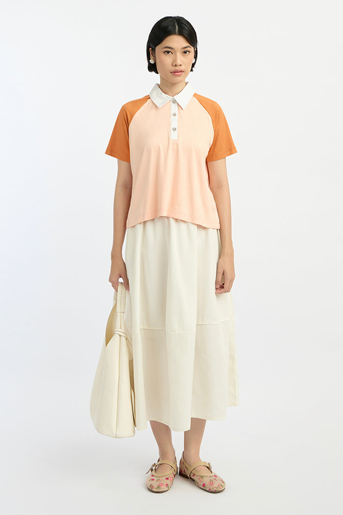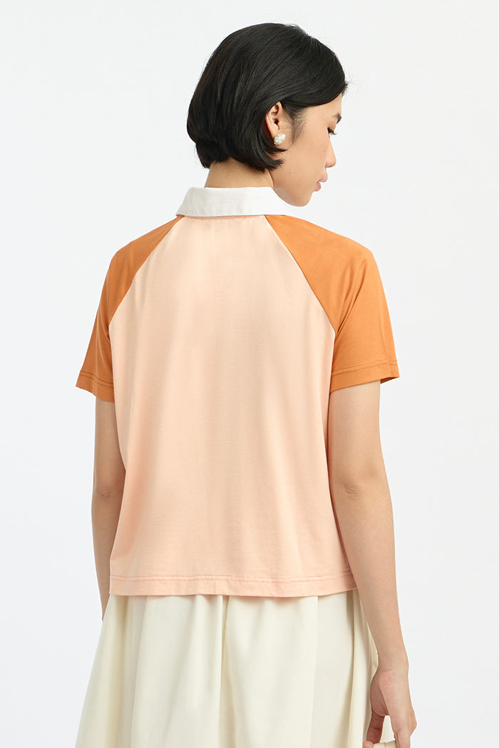 This raglan shirt features a two-tone design that brings a modern sporty-chic feel. Pair it with a midi skirt and loafers for a polished look, or wear with relaxed joggers and sneakers for laid-back look.