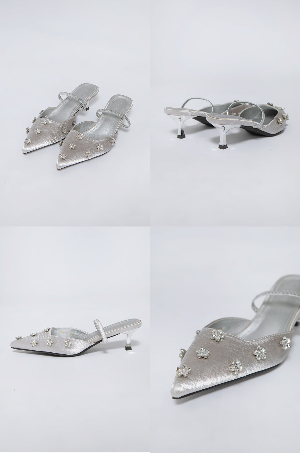 These kitten heels are adorned with floral embellishments that catch the light with every step.