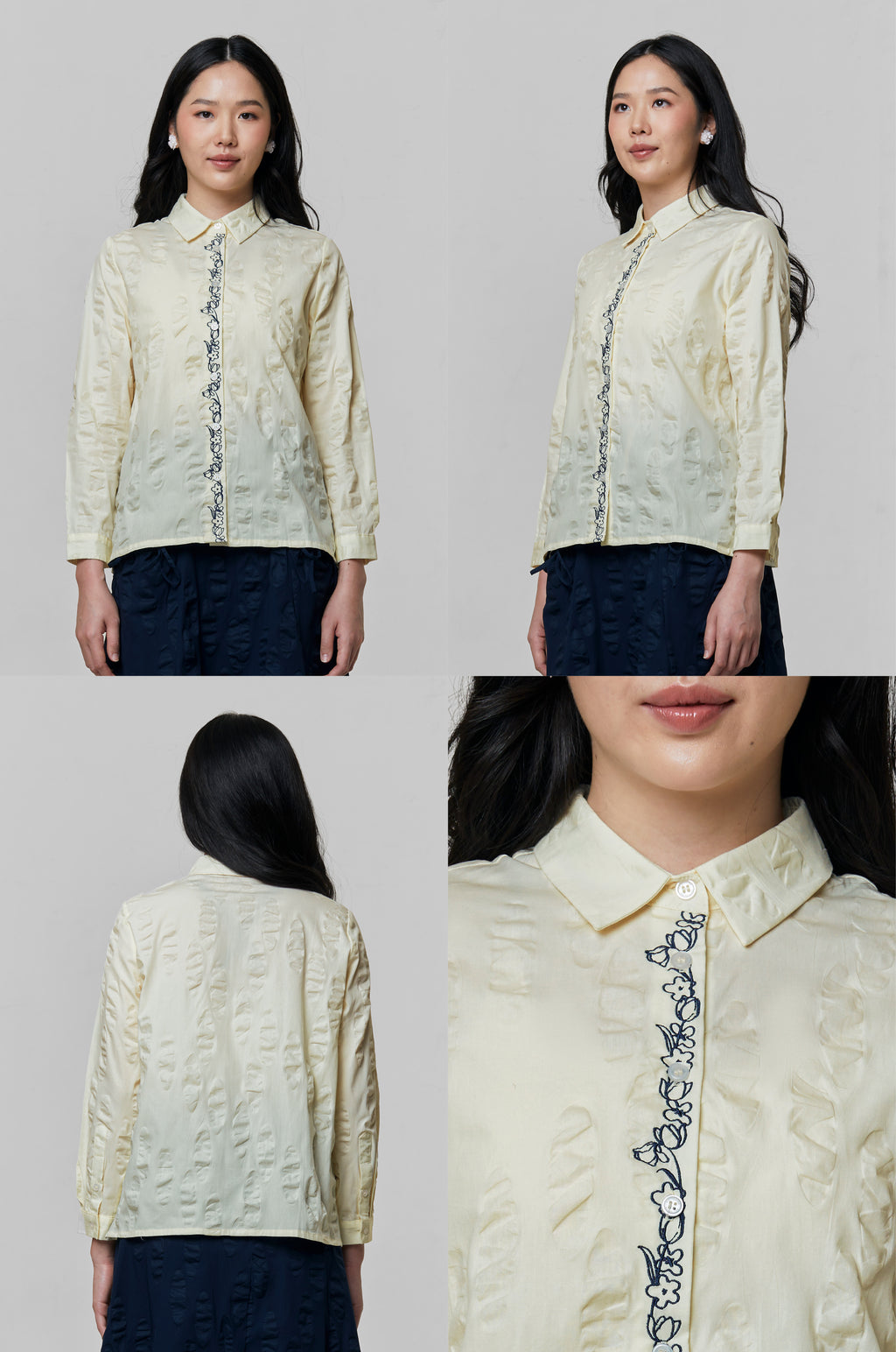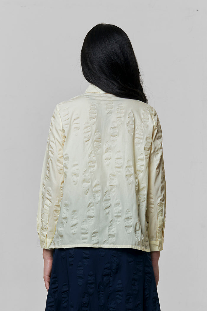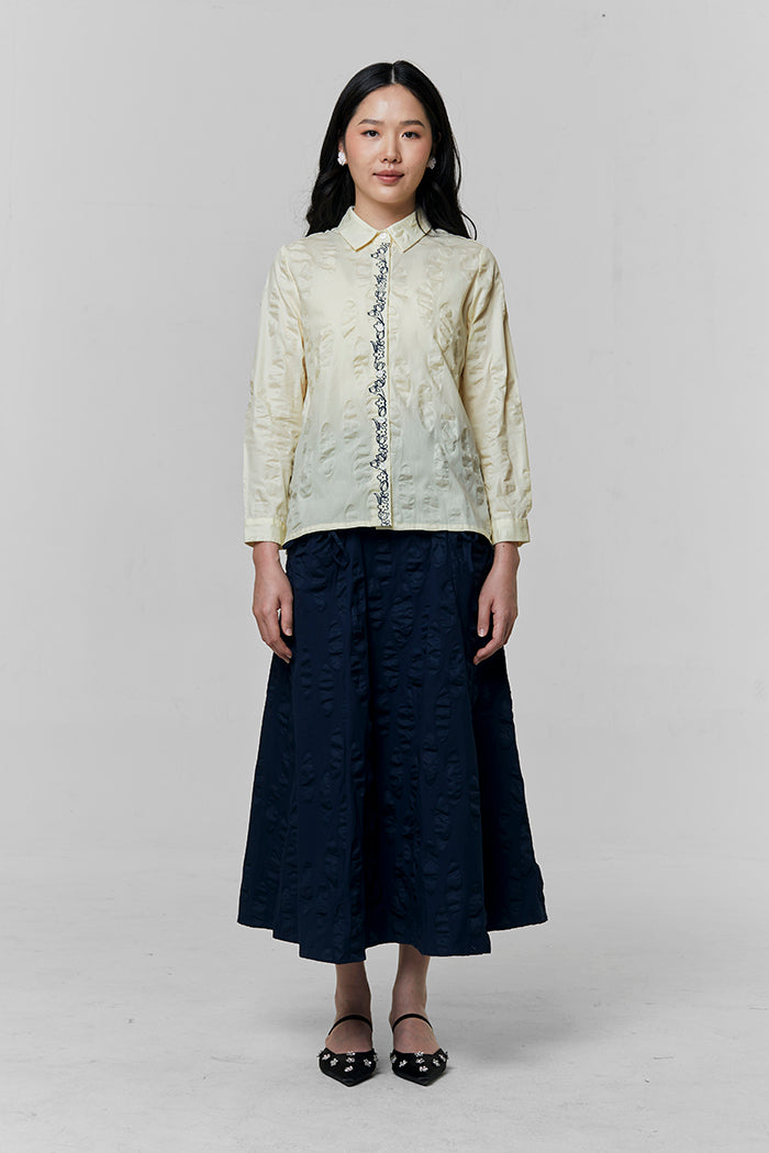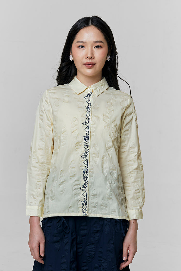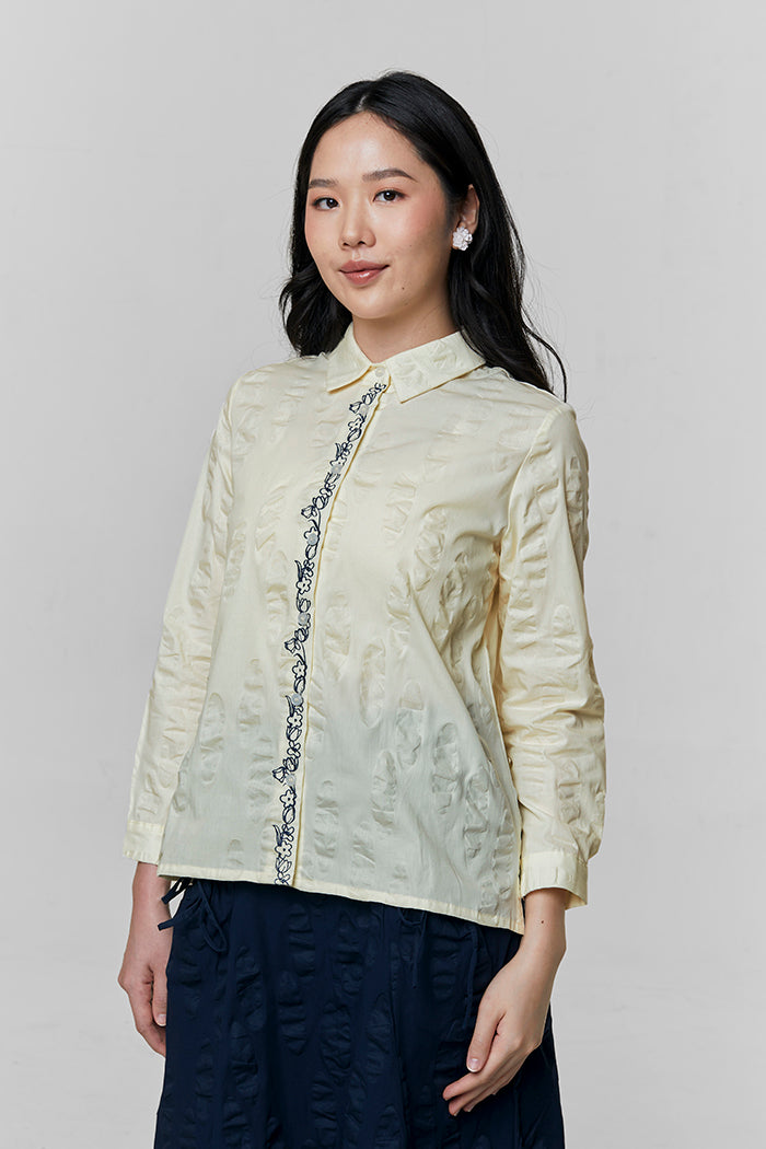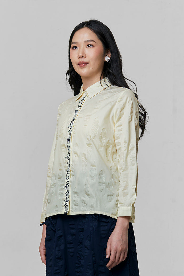 Cut from textured cotton in an oversized silhouette, this shirt defined by its intricately embroidered placket on the front button opening.