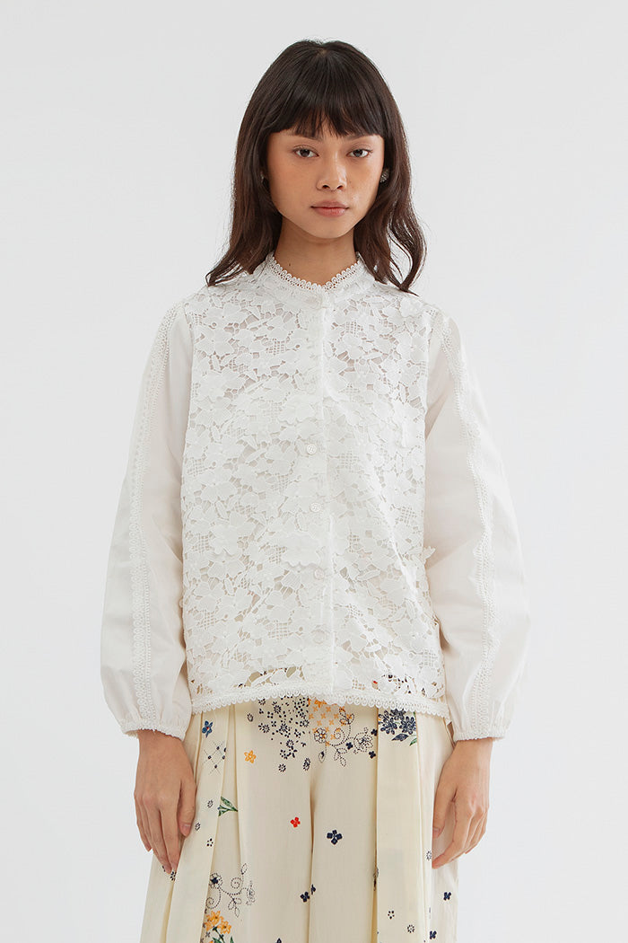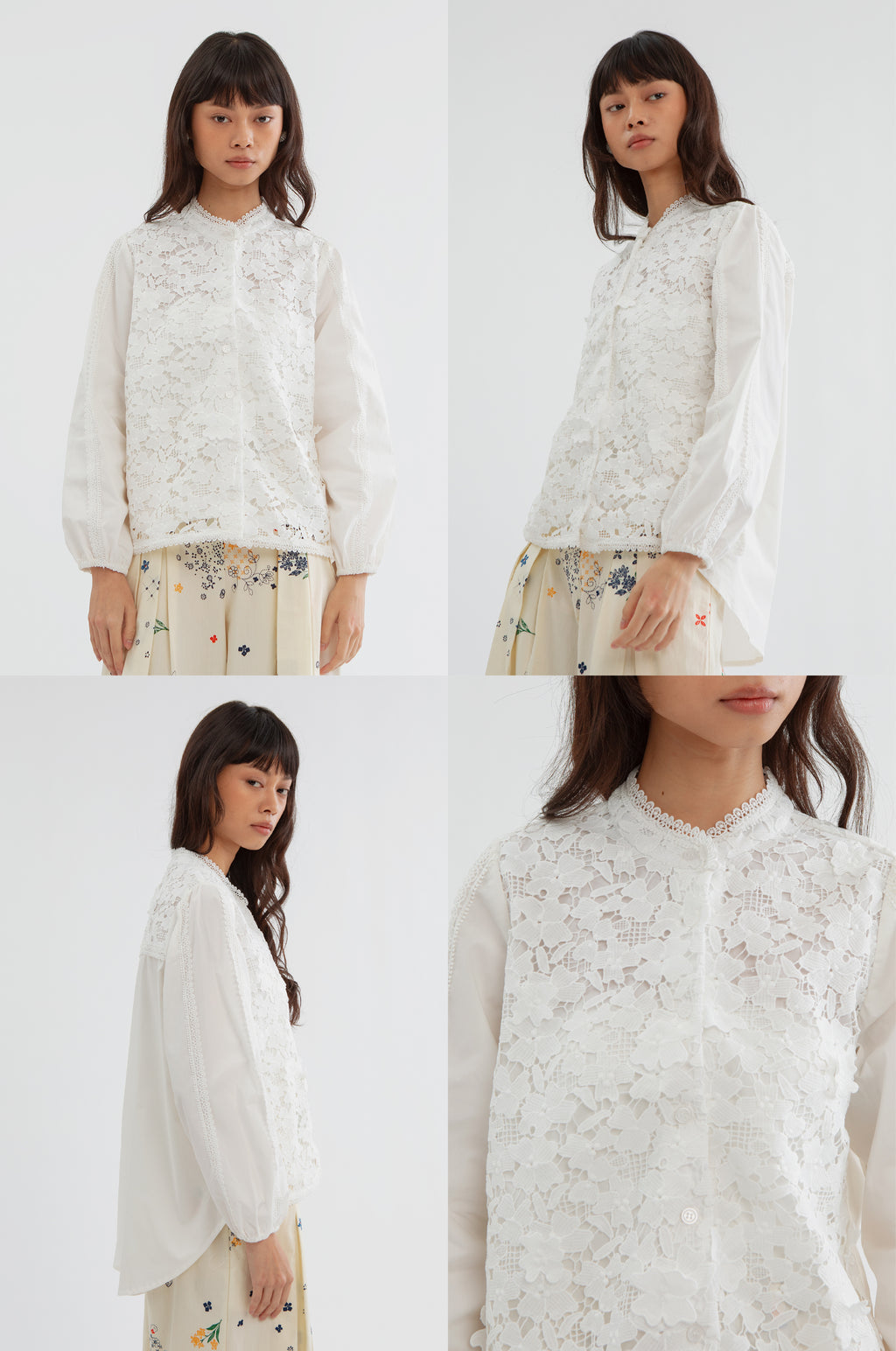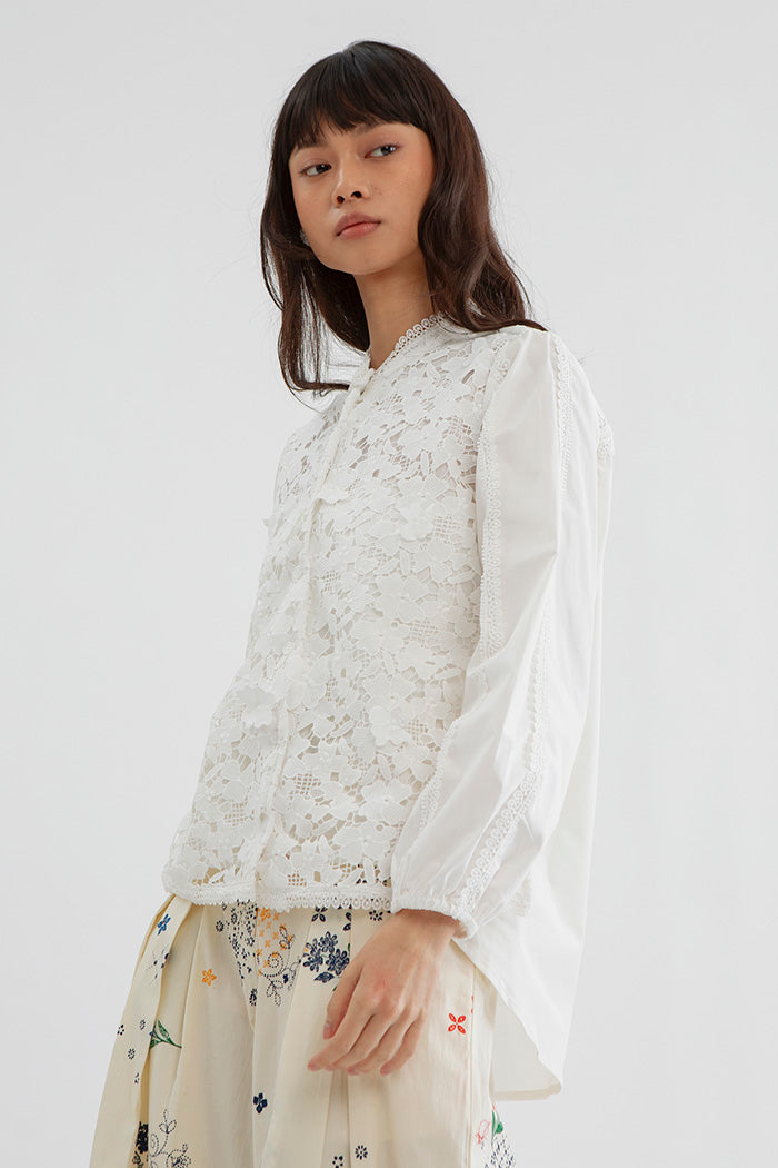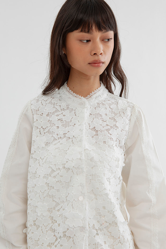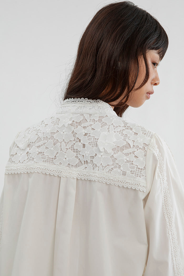 This shirt elevates an everyday essential with refined lace detailing and a sleek stand collar. Crafted from crisp, breathable cotton, it’s cut to a boxy silhouette with slightly billowy sleeves.