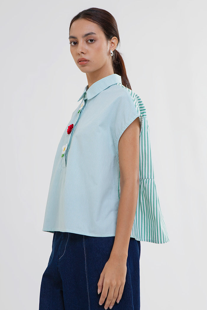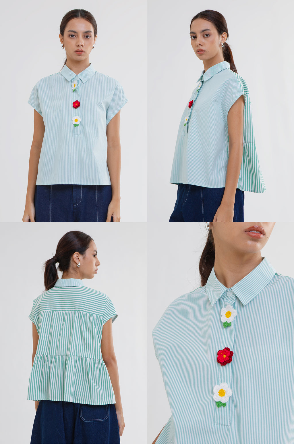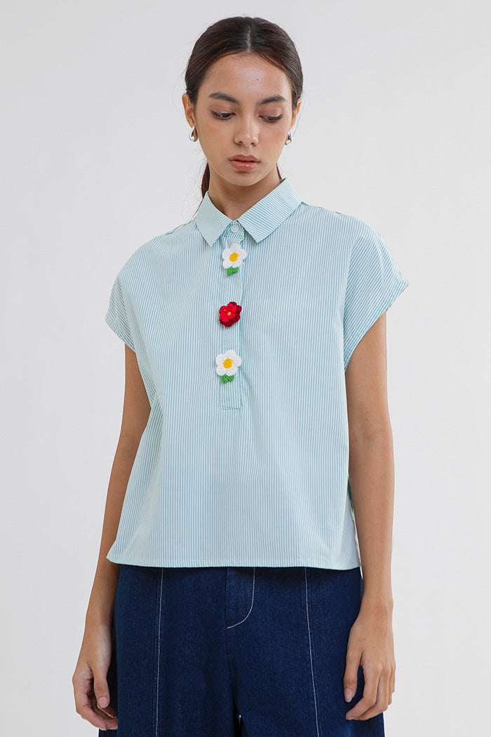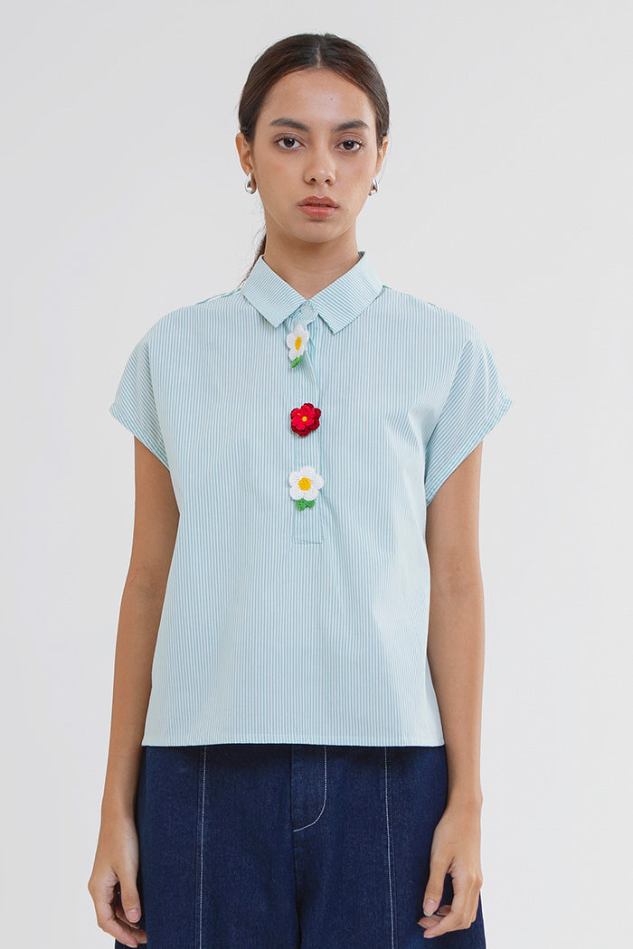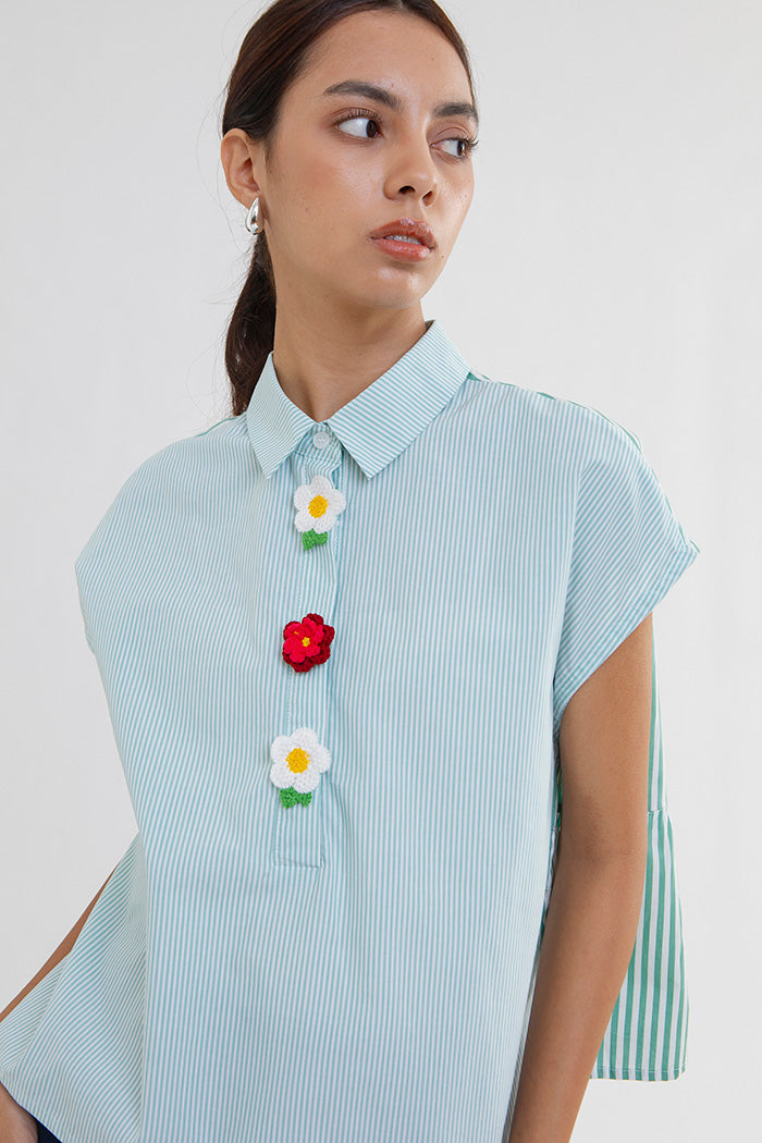 This cap sleeve shirt is designed with subtle gathering that creates volume through the silhouette. Features a regular collar and crochet detailing on the button opening.