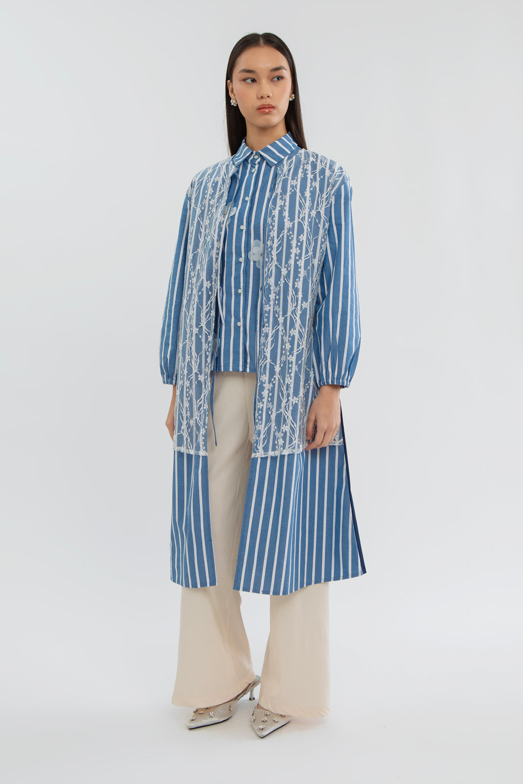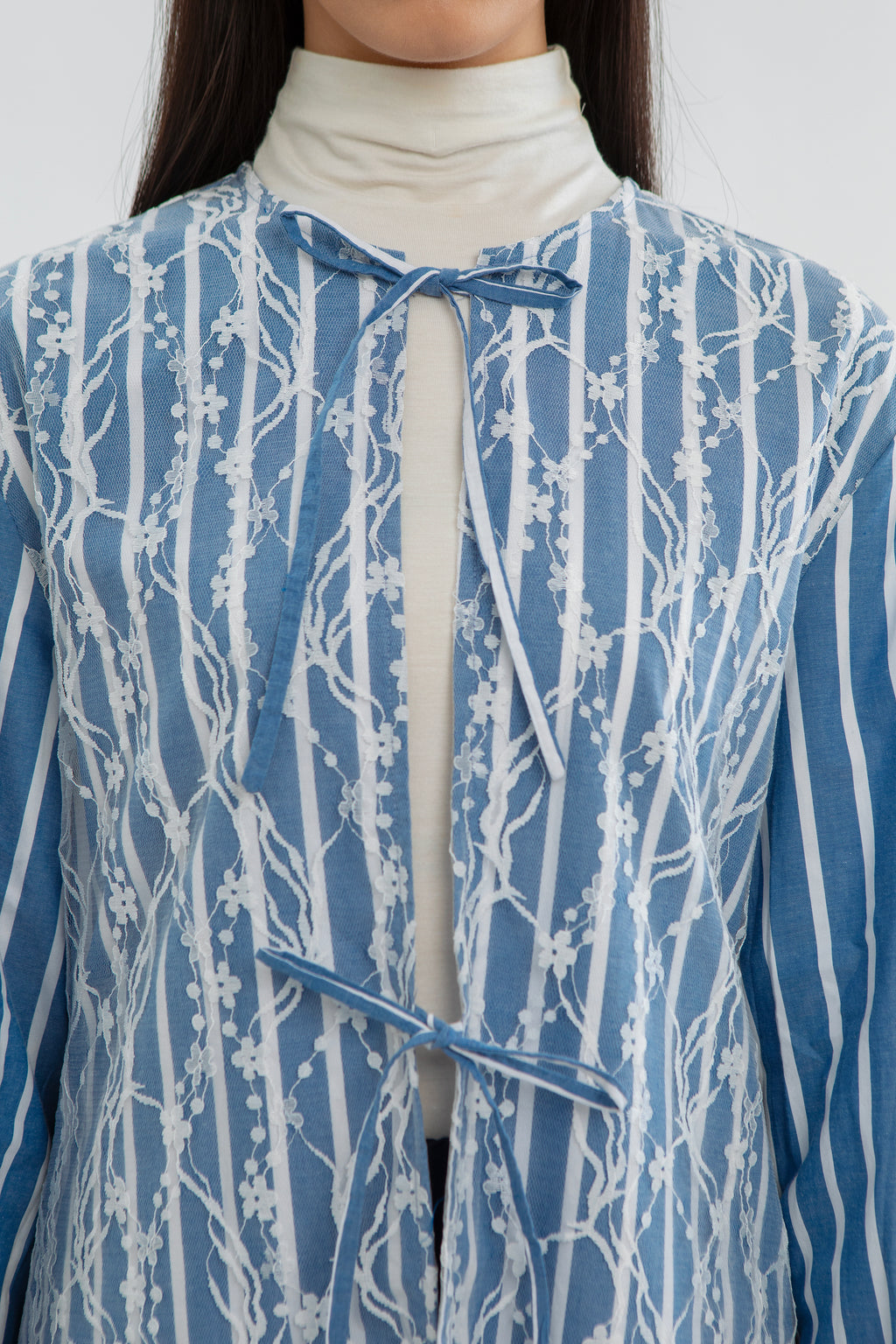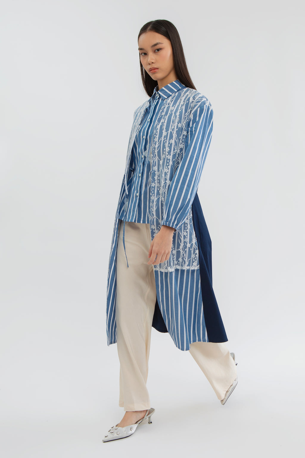 This long outerwear silhouette is reimagined in a delicate mix of cotton and lace for a feminine feel. Layer it over dresses or your favorite matching separates.