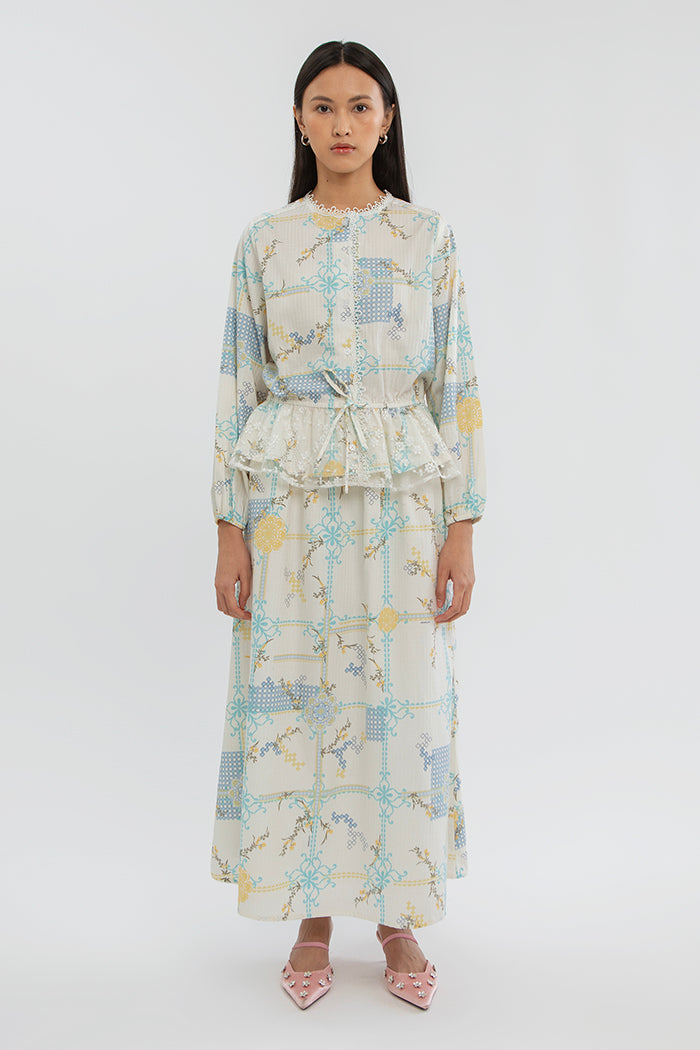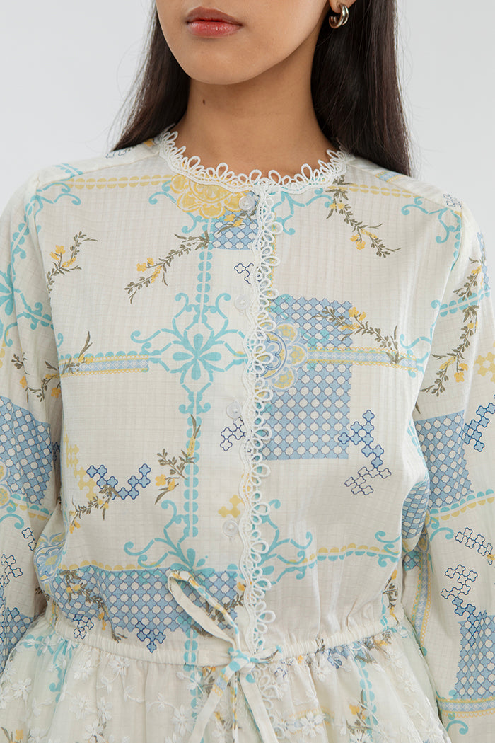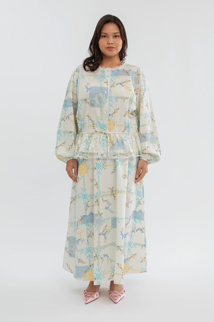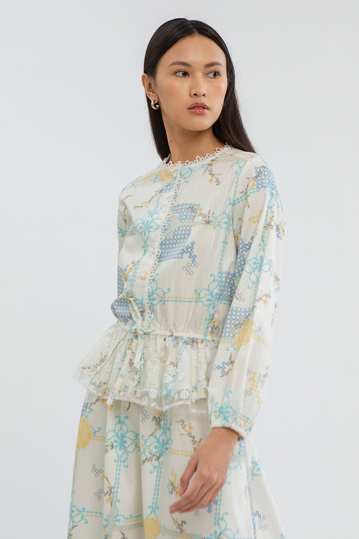 Cut from cotton-blend fabric, this long-sleeve shirt is cut to a fitted silhouette and finished with a softly flared lace peplum hem for a flattering shape.