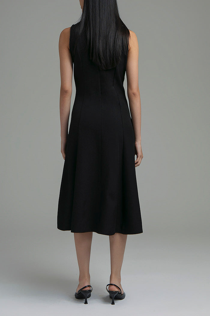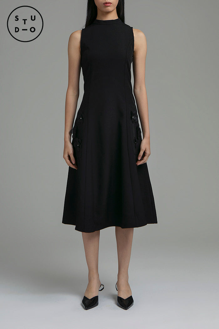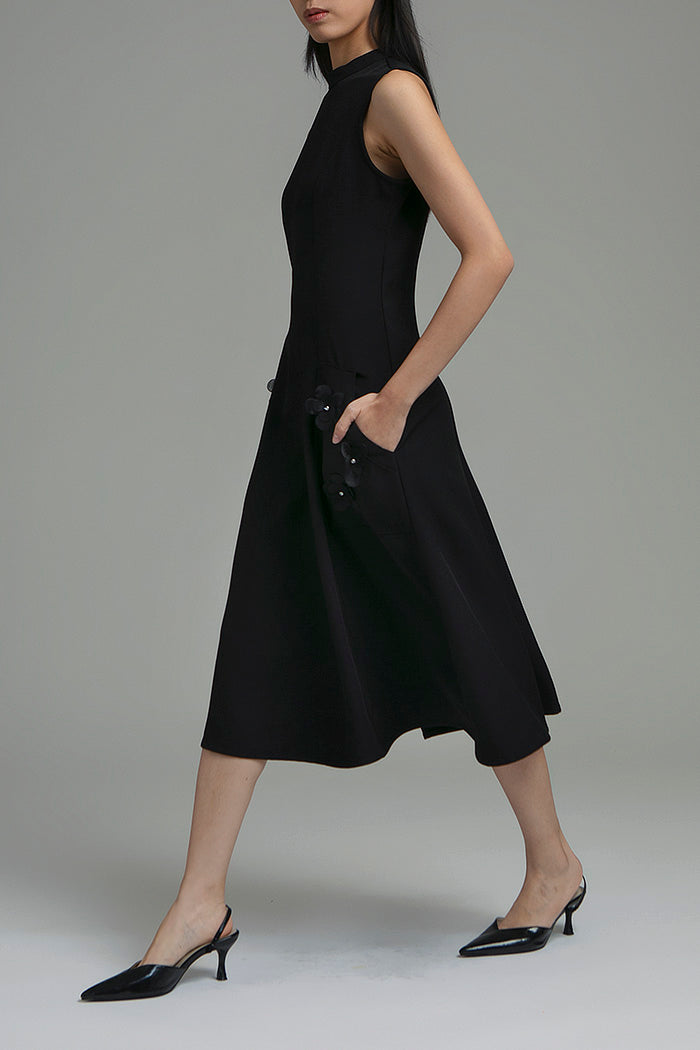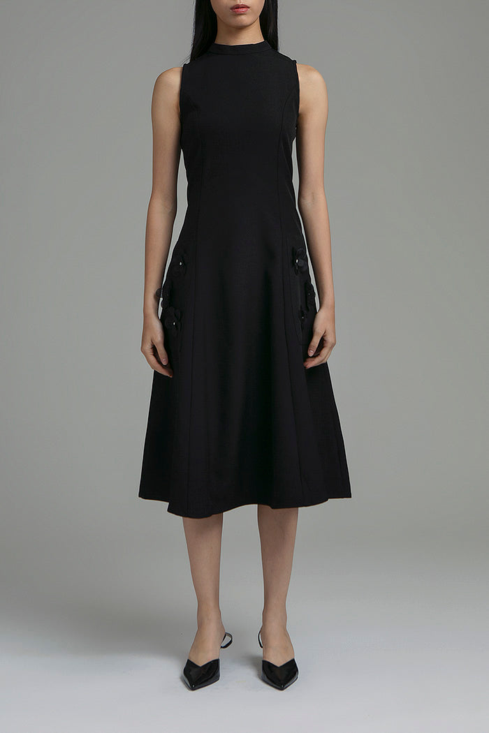 This midi dress is designed for a slightly fitted bodice that falls into a flowy skirt. Has high neckline, front pockets with flower applique detailing and a zipped up opening.