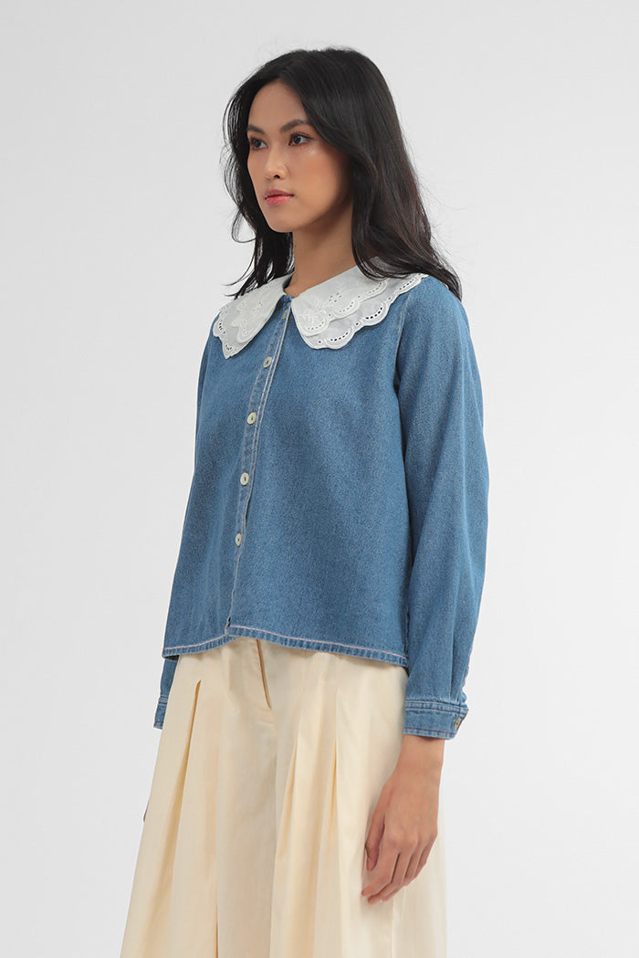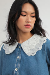 Cut to perfection with an embroidered big collar and cuffed sleeves for an oversized silhouette, this denim shirt is one you're going to wear on repeat for date nights with your favorite midi skirts or wide leg pants.